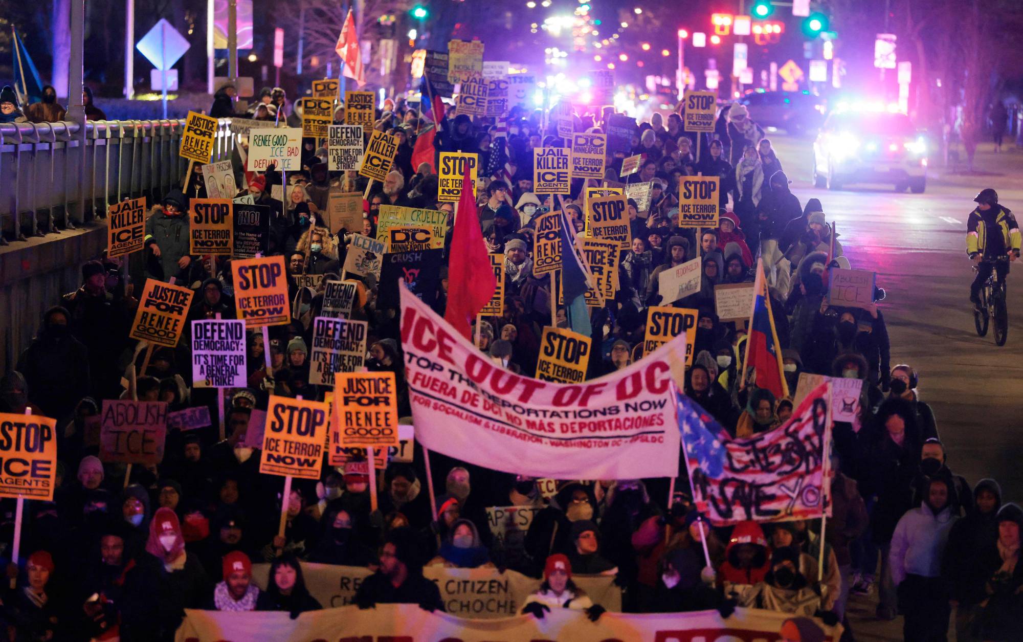 وتجمع مئات المحتجين في واشنطن ومدن أصغر مثل آشفيل بولاية نورث كارولاينا، حيث نظموا مسيرات في وسط المدينة وظهروا ⁠في مقاطع مصورة نُشرت على الإنترنت وهم يهتفون «لا لإدارة الهجرة والجمارك.. لا ‍لجماعة كو كلوكس ‍كلان.. لا للفاشية الأميركية».