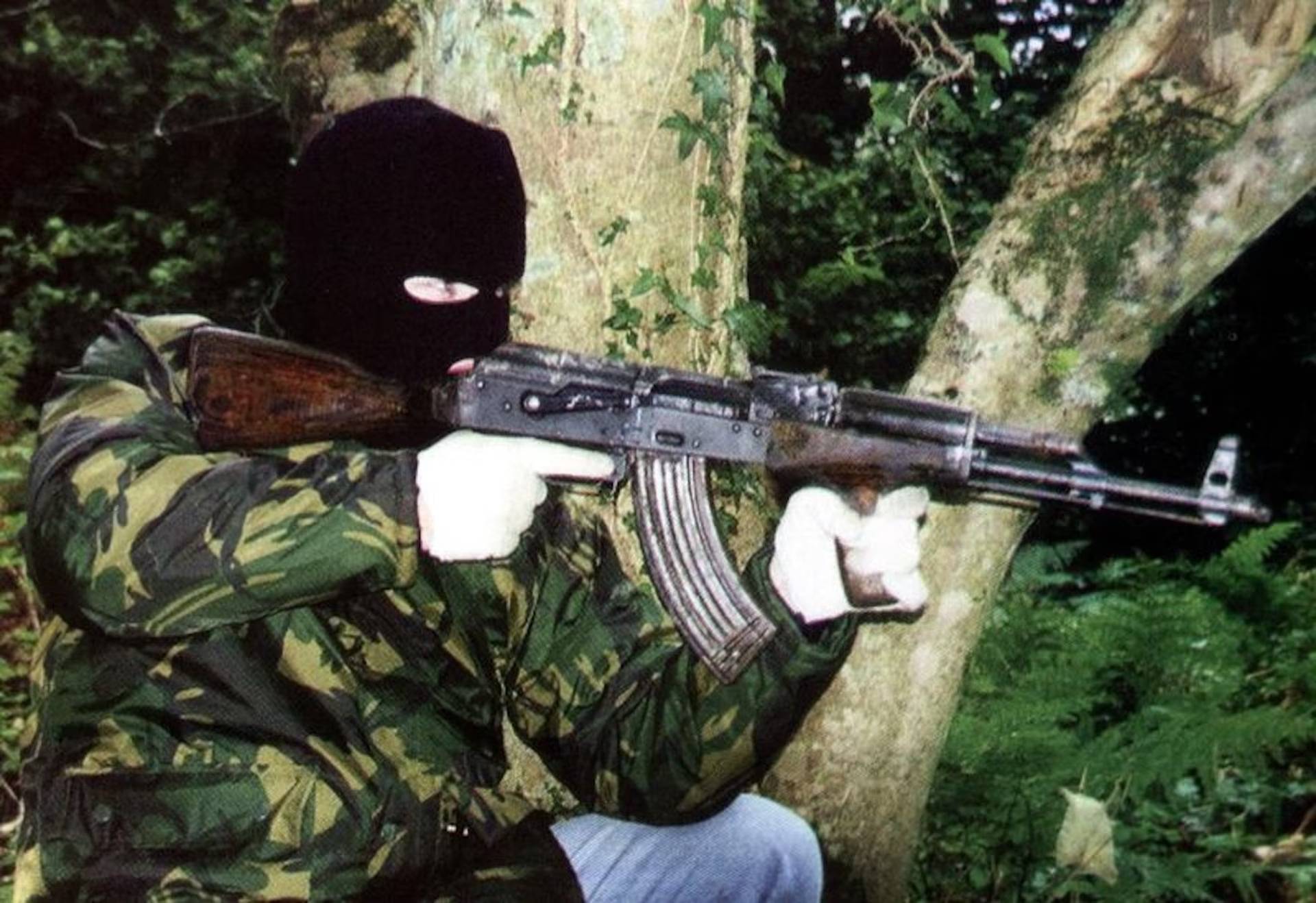 صورة أرشيفية غير مؤرخة تُظهر عضواً في الجيش الجمهوري الآيرلندي يحمل بندقية هجومية من طراز AK – 47 في مكان غير معلوم في آيرلندا (رويترز)