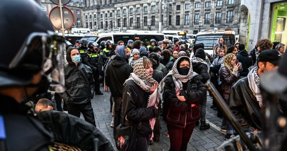 “يحدث في أمستردام! يتحدى الشعب الهولندي الحظر المفروض على الاحتجاجات، ويتدفقون إلى الشوارع تضامنًا مع فلسطين وإدانة مثيري الشغب الإسرائيليين العنيفين في كرة القدم الذين هاجموا مدينتهم”.