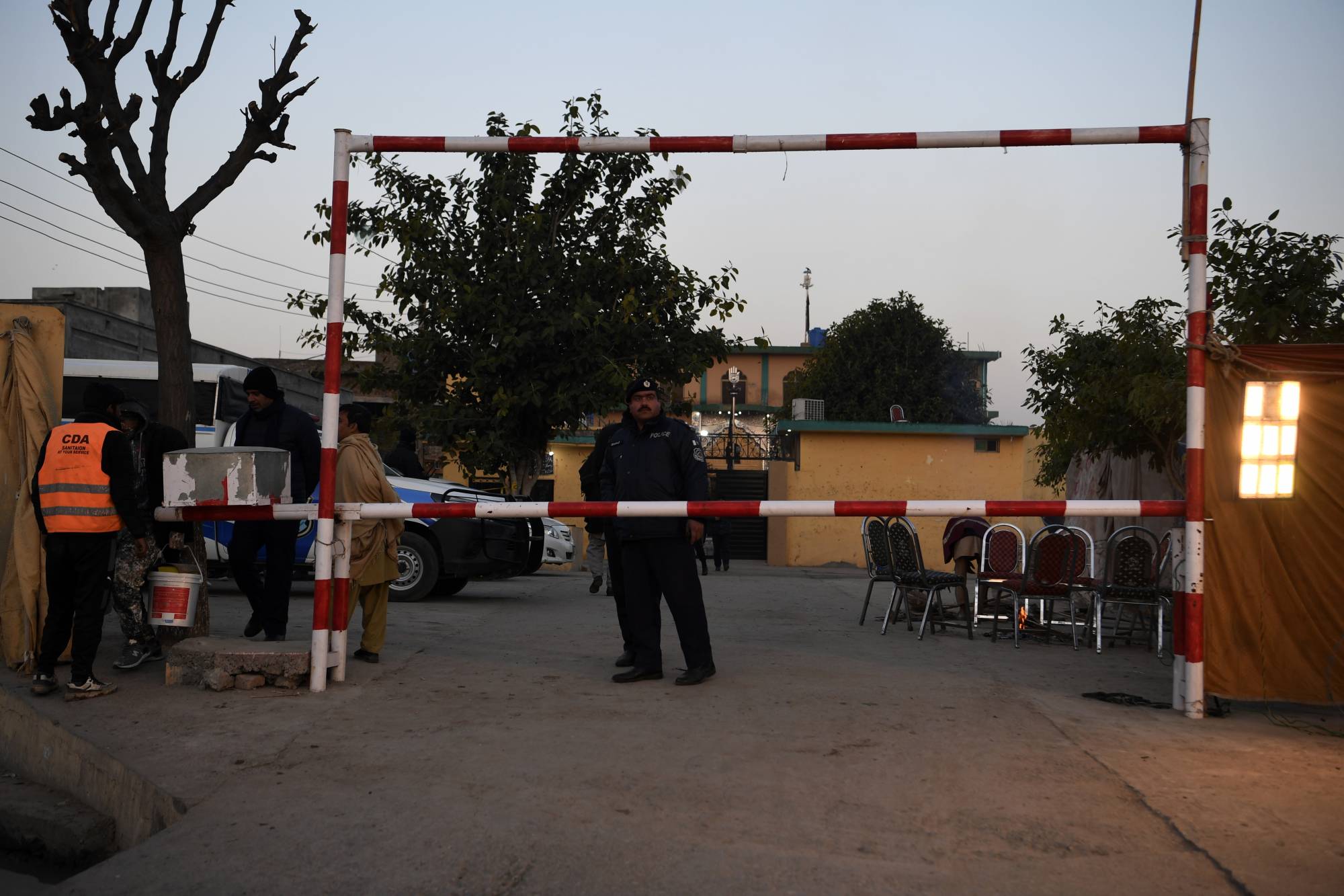 مسؤول أمني باكستاني يقف حارساً خارج مسجد شيعي في اليوم التالي لتفجير انتحاري بإسلام آباد 7 فبراير 2026 (إ.ب.أ)