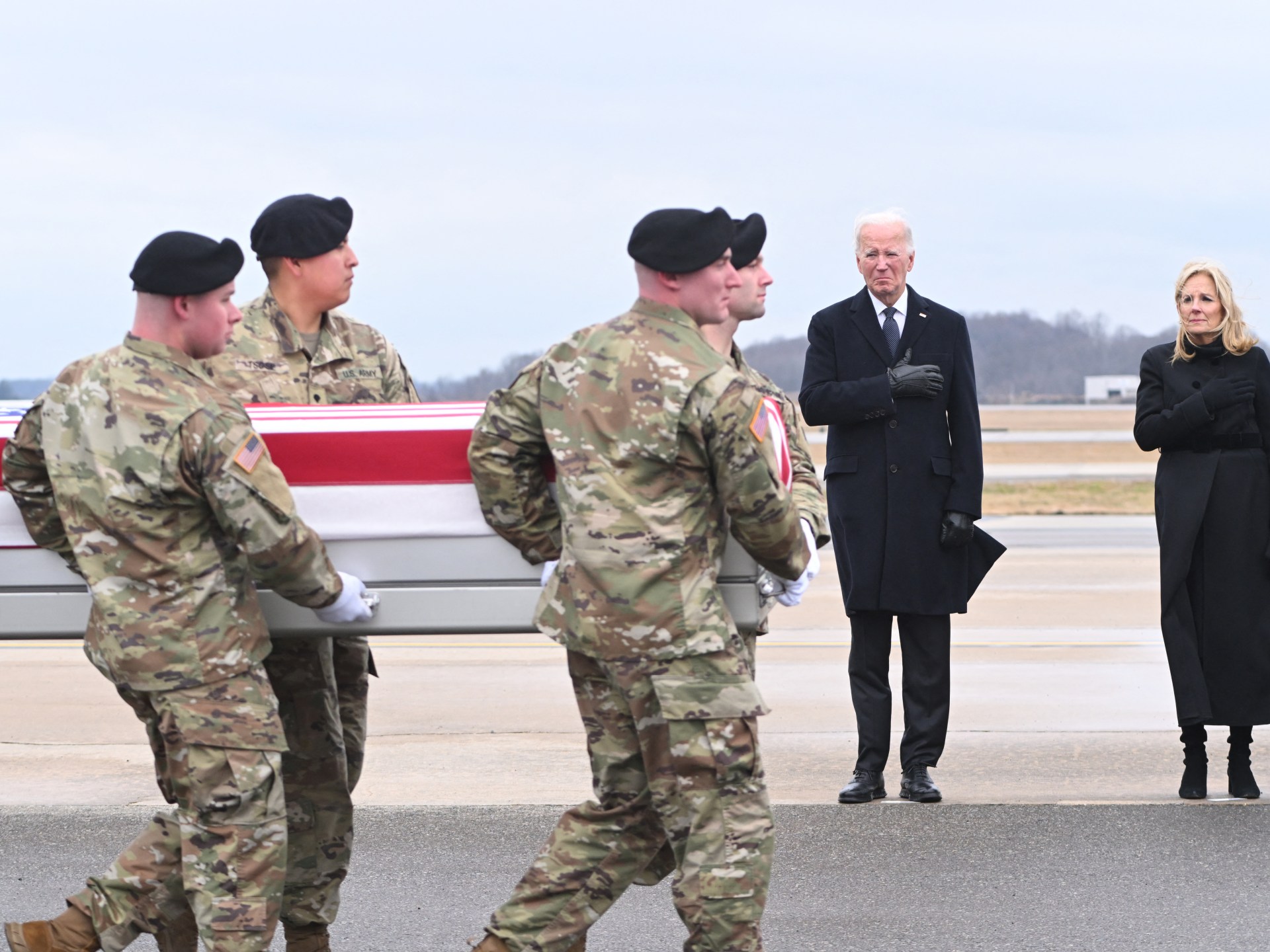 الرئيس الأمريكي جو بايدن يشارك في مراسم استقبال الجنود الثلاثة الذين قتلوا في هجوم بطائرة مسيرة استهدفت القوات الأمريكية في #الأردن الأحد الماضي pic.twitter.com/HOdSwc4uLW