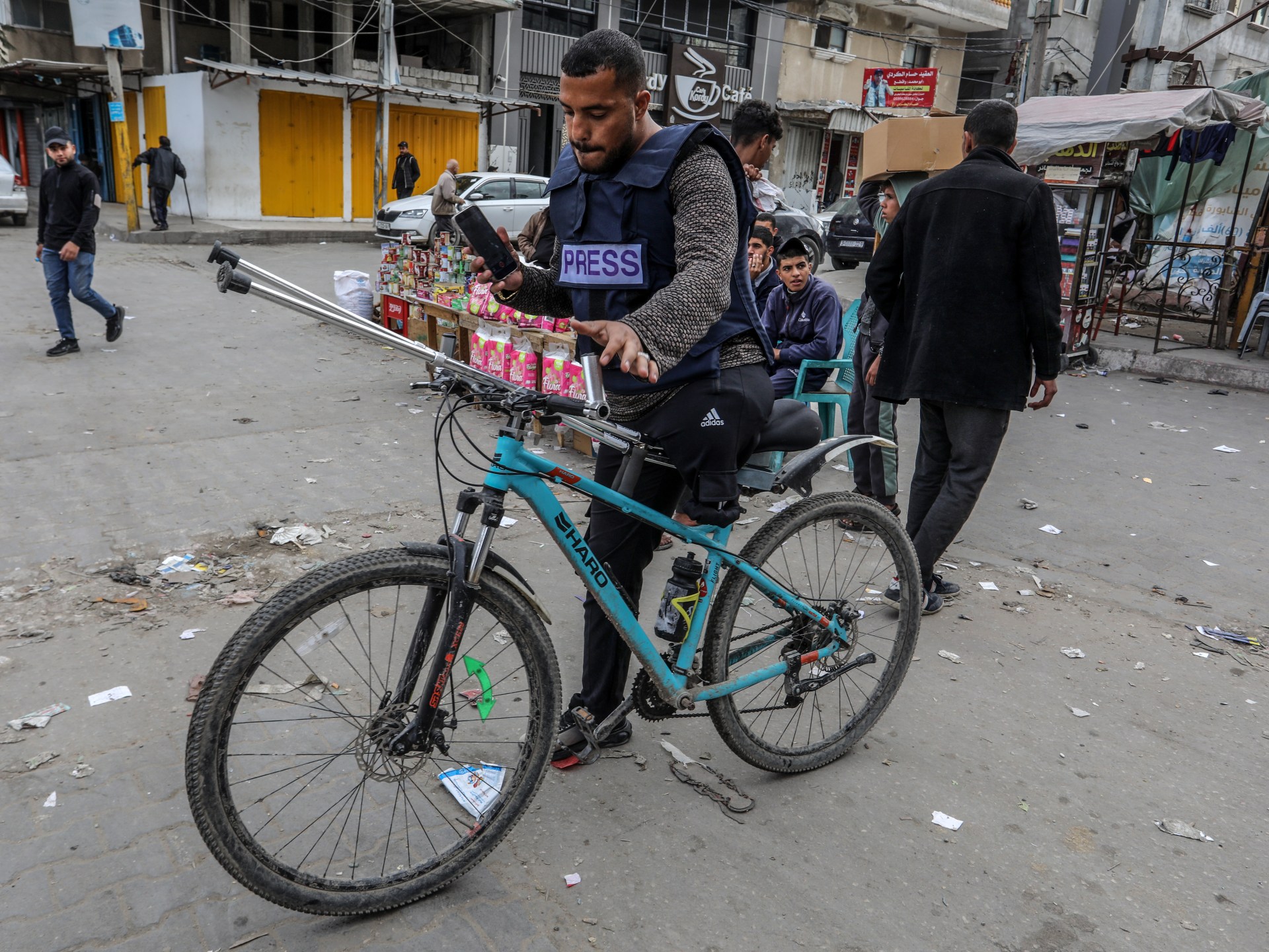 يتحدى الصحفي الفلسطيني حازم سليمان (33 عاما) الصعاب بساق واحدة، حيث يتنقل بدراجته الهوائية في شوارع مدينة رفح جنوبي قطاع غزة، وفي يده هاتفه المحمول الذي يوثق من خلاله تداعيات العدوان الإسرائيلي على القطاع.
