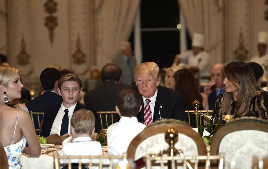 ترمب متوسطاً زوجته ميلانيا وابنه بارون خلال عشاء عيد الشكر في مارالاغو عام 2018 (أ.ب)