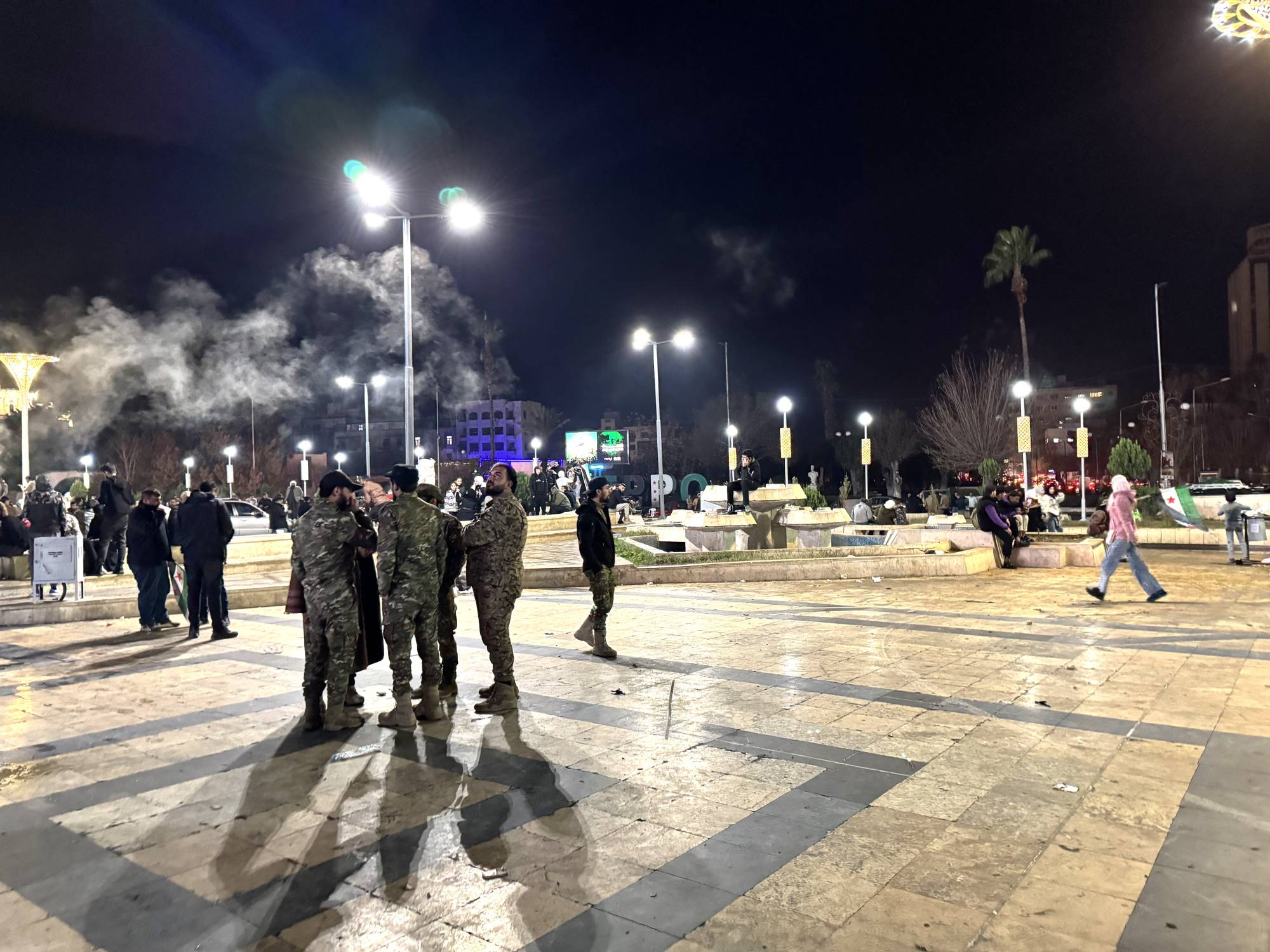 رجال أمن سوريون في ساحة سعد الله الجابري في حلب ليلة الاحتفال بسقوط نظام الأسد في 7 ديسمبر 2025 (الشرق الأوسط)