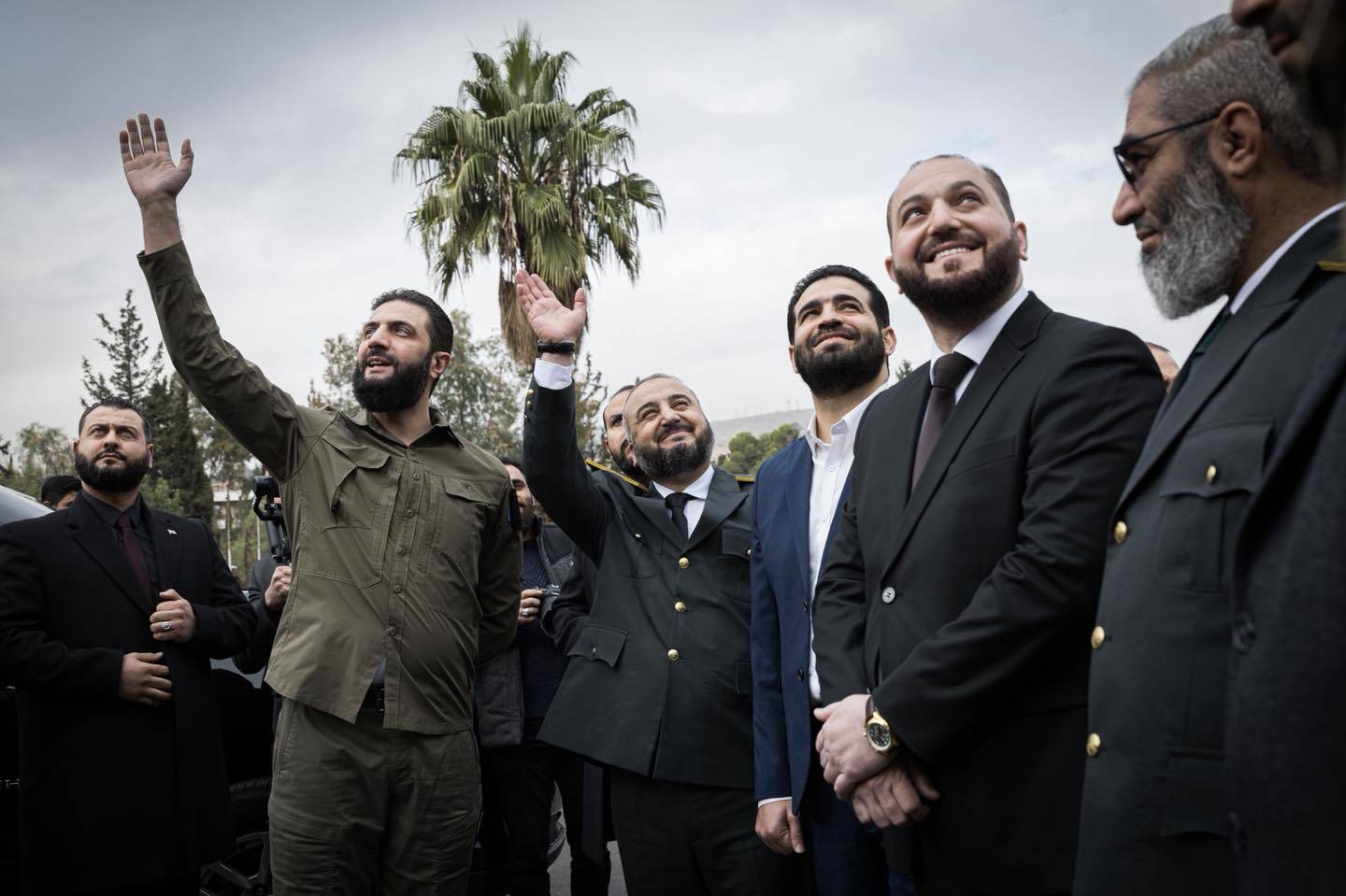 الرئيس السوري أحمد الشرع ووزير الدفاع مرهف أبو قصرة يلوّحان للسوريين خلال عرض عسكري في دمشق (وزارة الدفاع السورية)