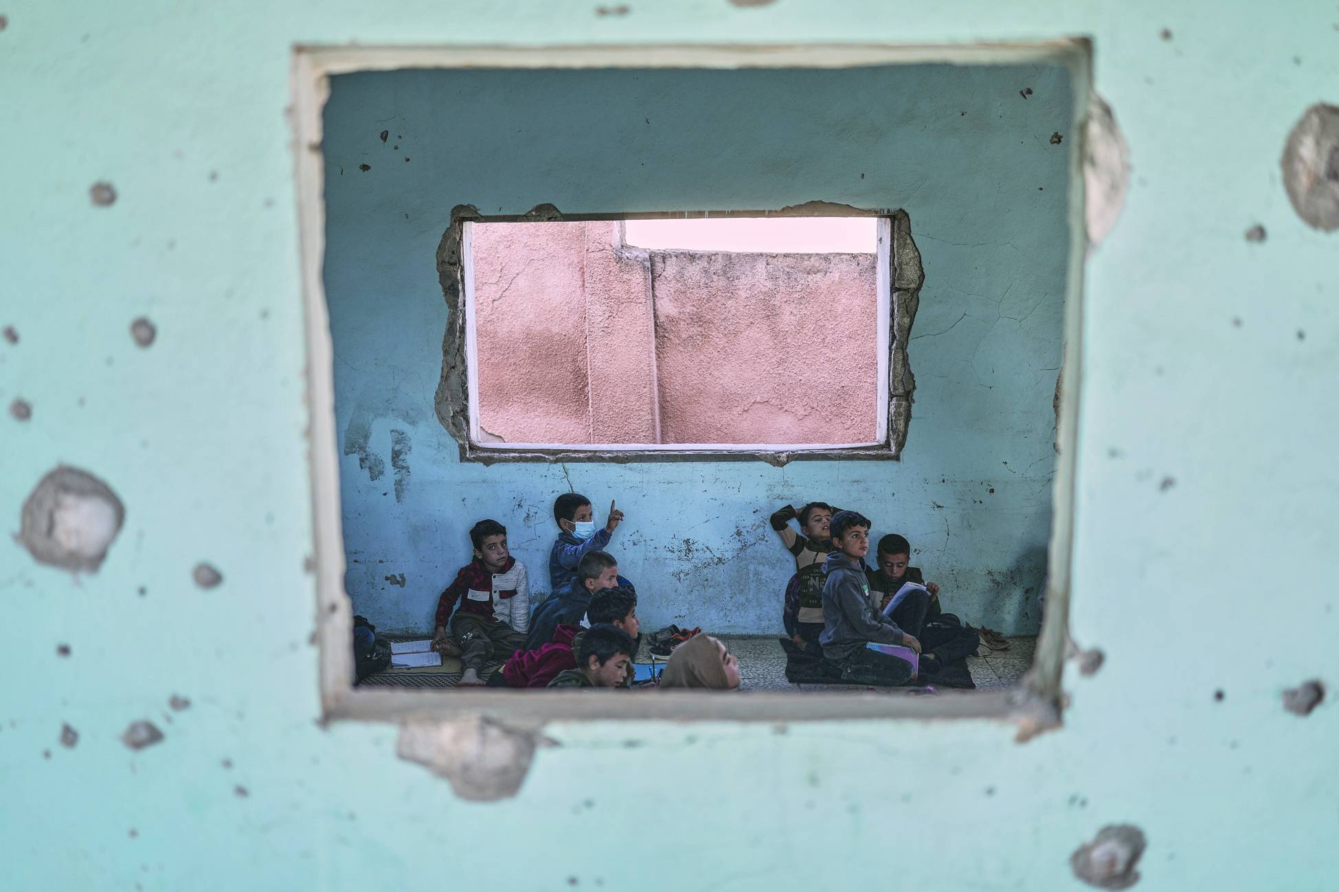 طلاب يحضرون الفصول الدراسية داخل مدرسة معر شمارين الابتدائية وتبدو جدرانها مليئة بثقوب الرصاص من القتال بين القوات الموالية للرئيس السابق بشار الأسد والمعارضة بقرية معر شمارين في ريف إدلب بسوريا 19 أكتوبر 2025 (أ.ب)