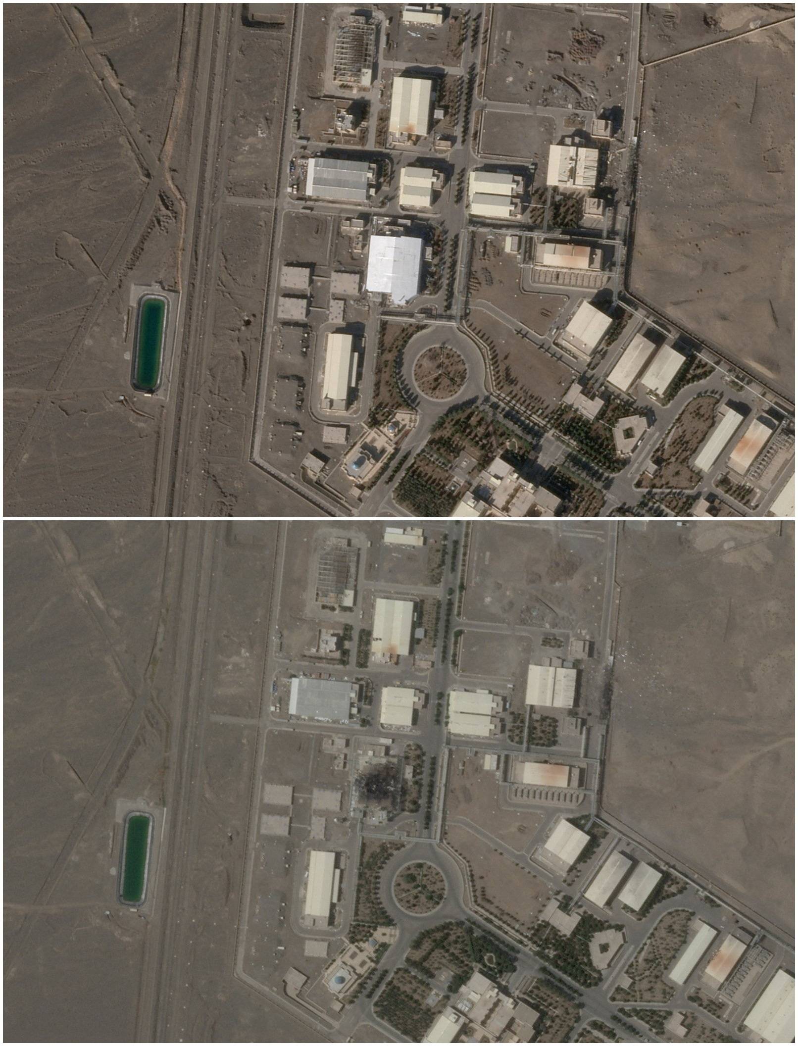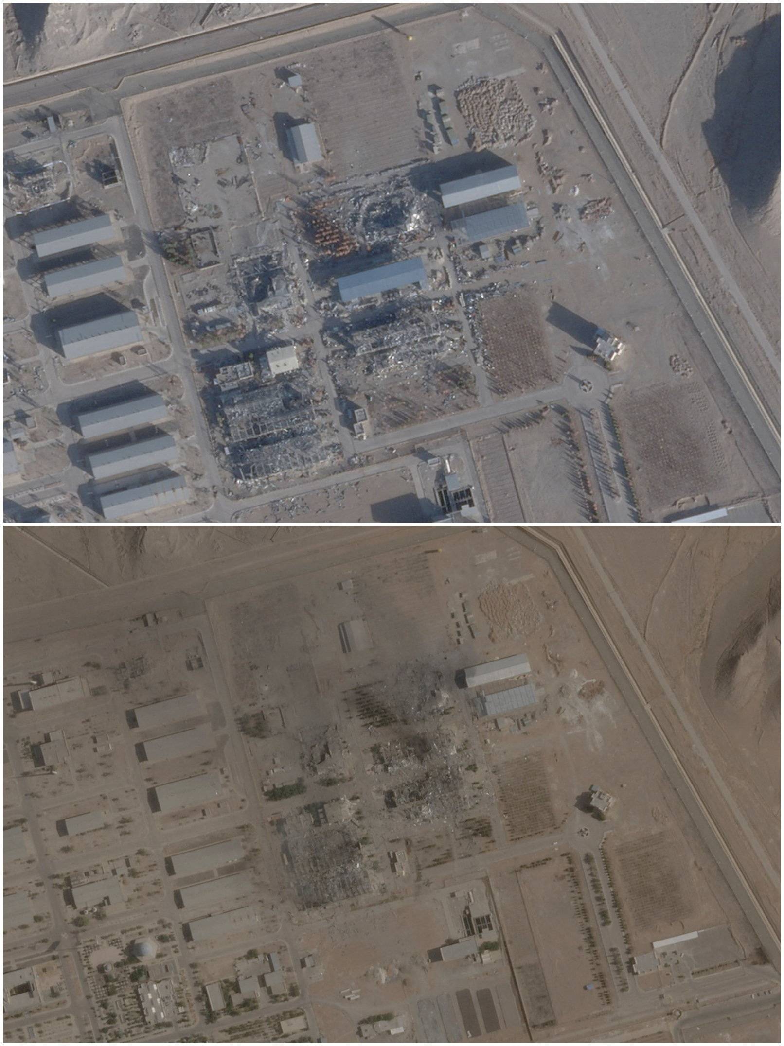 تُظهر مجموعة من صور القمر الصناعي «بلانِت لابس» مبنى كان مدمراً سابقاً (في الأسفل) وسقفاً جديداً أُقيم فوقه (في الأعلى) بموقع نطنز النووي بإيران (رويترز)