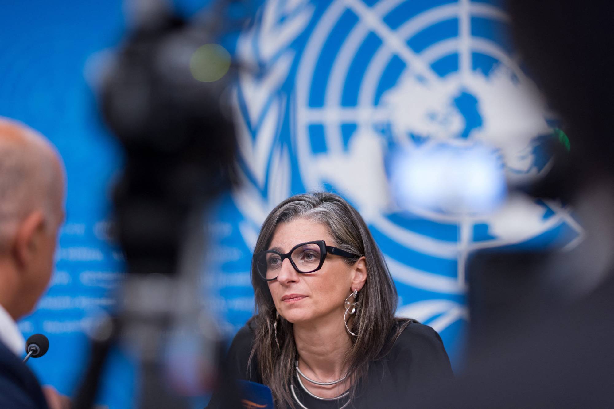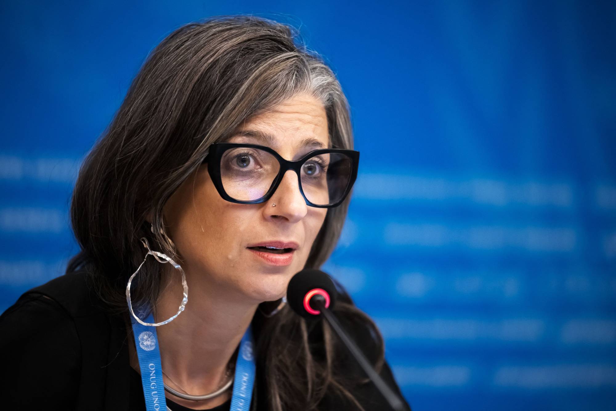 مقررة الأمم المتحدة بشأن الأراضي الفلسطينية فرانشيسكا ألبانيزي تتحدث في جنيف عن وضع حقوق الإنسان في غزة (أ.ف.ب)