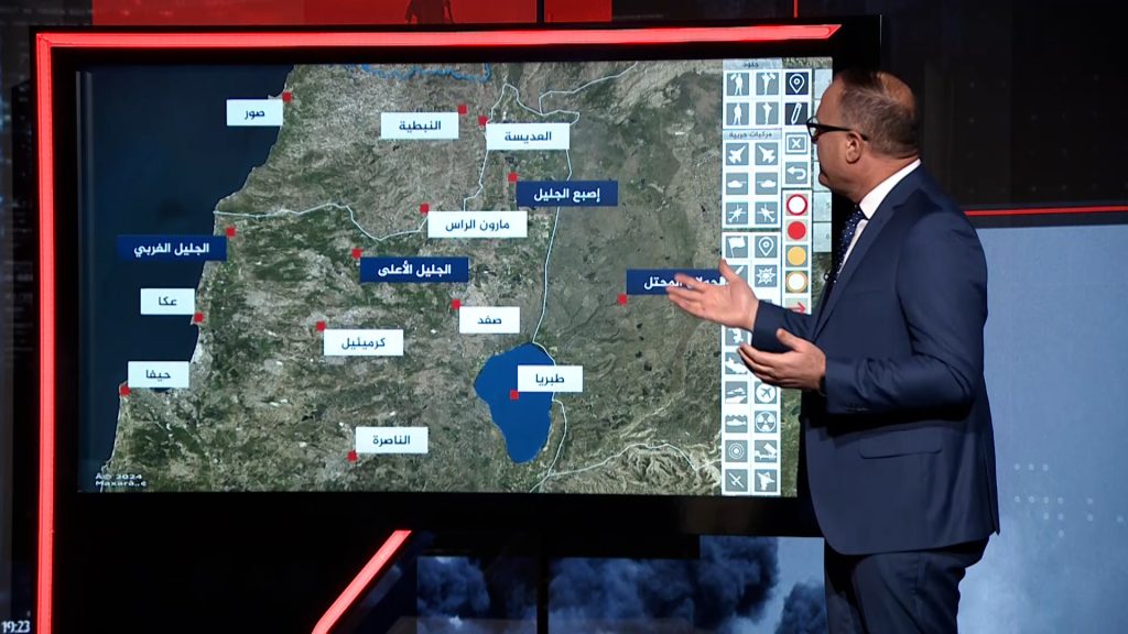 كما تظهر الخريطة الأماكن الإسرائيلية التي استهدفها القصف الصاروخي الذي نفذه حزب الله اللبناني نهار اليوم السبت.