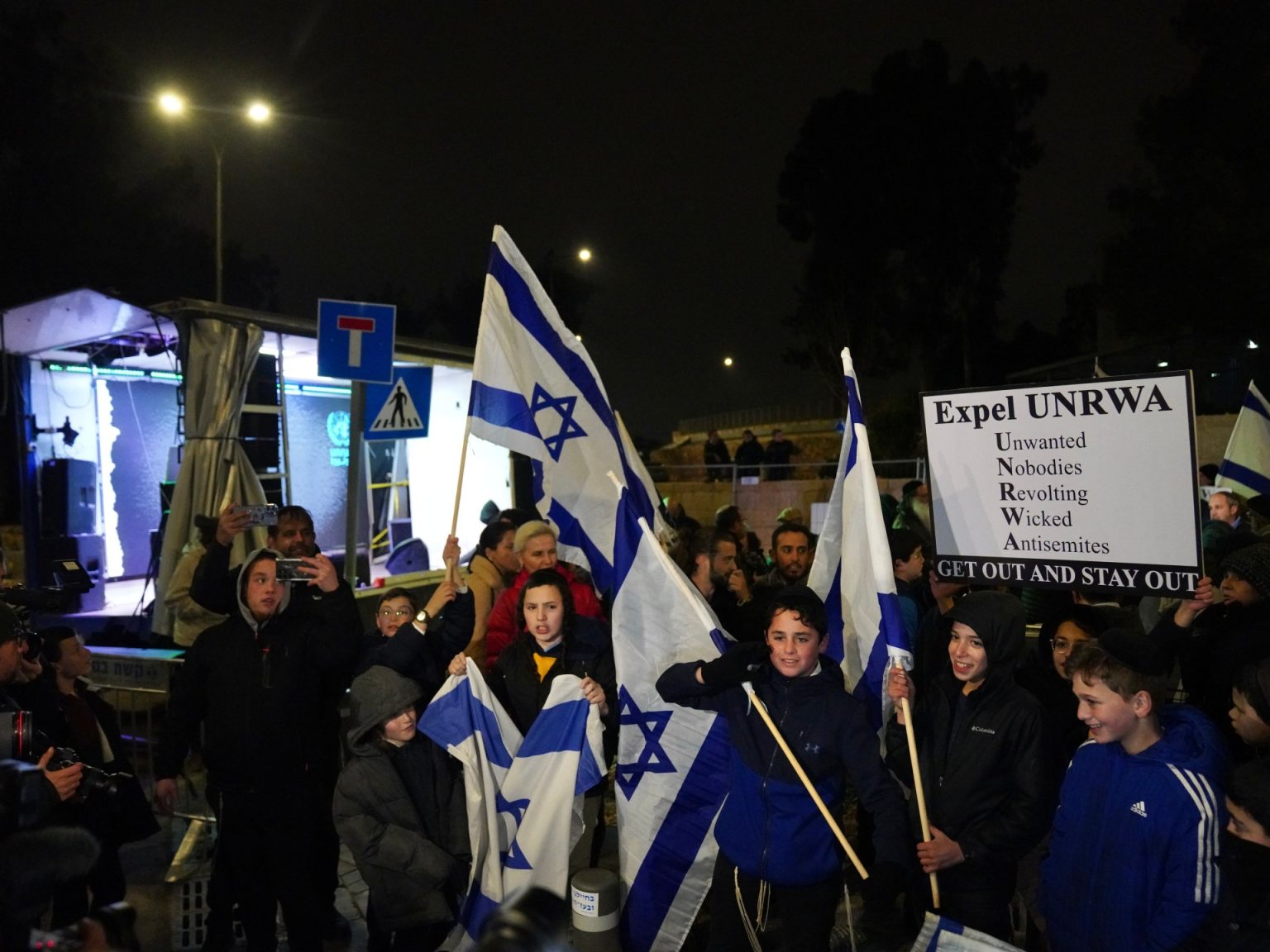مستوطنون في مظاهرة مناهضة للأونروا أمام مقرها في حي الشيخ جراح بالقدس خلال فبراير الماضي (الجزيرة)