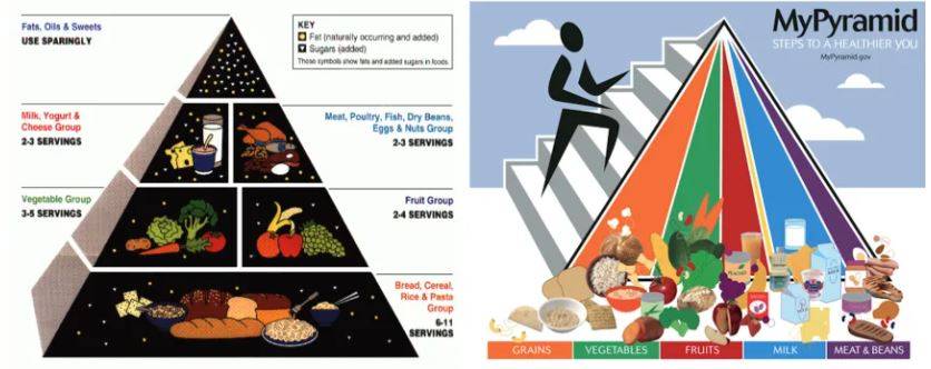كان الهرم الغذائي القديم يتألف من درجات واضحة تُوحي بالصعود. وكانت الحبوب الكاملة هي القاعدة، لأن الجسم يحتاج إلى طاقة أكبر، ومعظم الطاقة تأتي من النشويات والحبوب. أما الهرم الغذائي الجديد، فيضع الحبوب الكاملة في أسفل الهرم، مع أن إرشاداته تُركز على الحد من الحبوب المكررة، وليس الحبوب الكاملة.