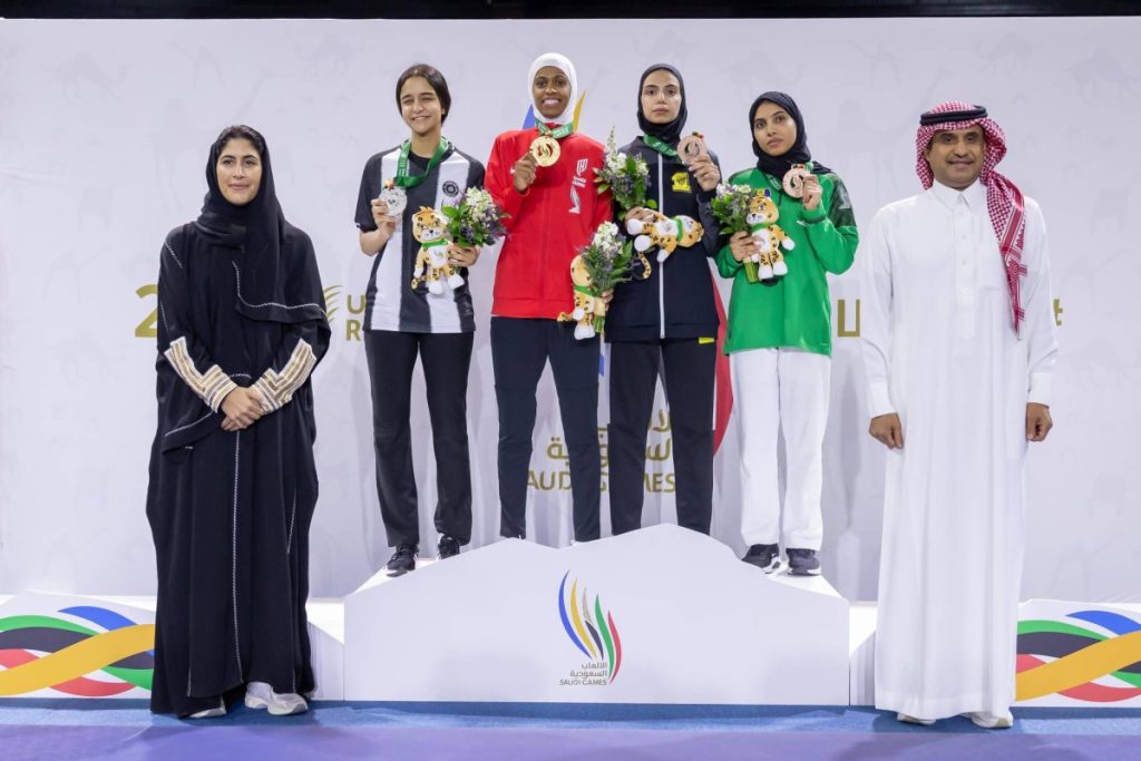 توجت الأميرة دليل بنت نهار، الرئيس التنفيذي لدورة الألعاب السعودية الفائزات بالميداليات لفئة وزن (-57) كجم في منافسات التايكوندو وهن دنيا ابوطالب (ذهبية) ولجين عطية (فضية) وليان المحمادي ووجدان العطوي (برونزية).
