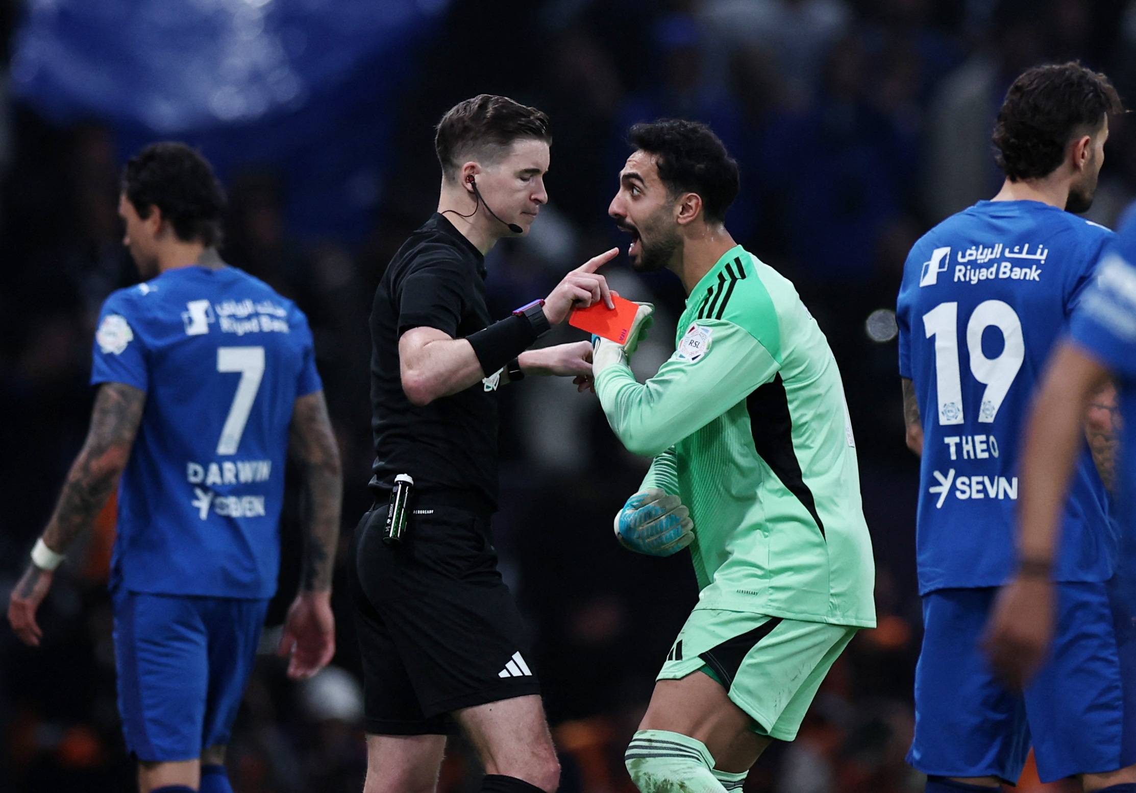 نواف العقيدي أصبح أول حارس مرمى يُطرد في تاريخ «ديربي الرياض» بالمسابقة (رويترز)