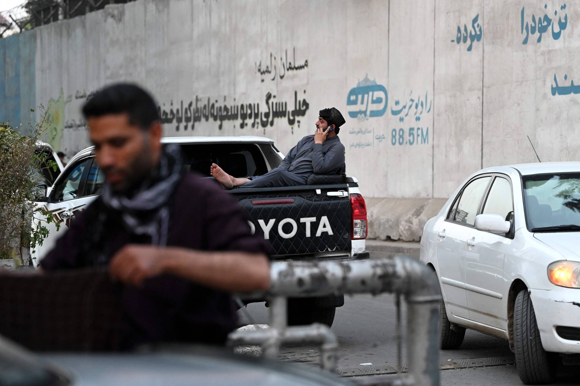 رجل أفغاني يتحدث على هاتفه الجوال وهو يجلس في صندوق سيارته بكابل – 1 أكتوبر 2025… عادت شبكات الهاتف الجوال والإنترنت في جميع أنحاء أفغانستان بعد 48 ساعة من قطع سلطات «طالبان» للاتصالات (أ.ف.ب)