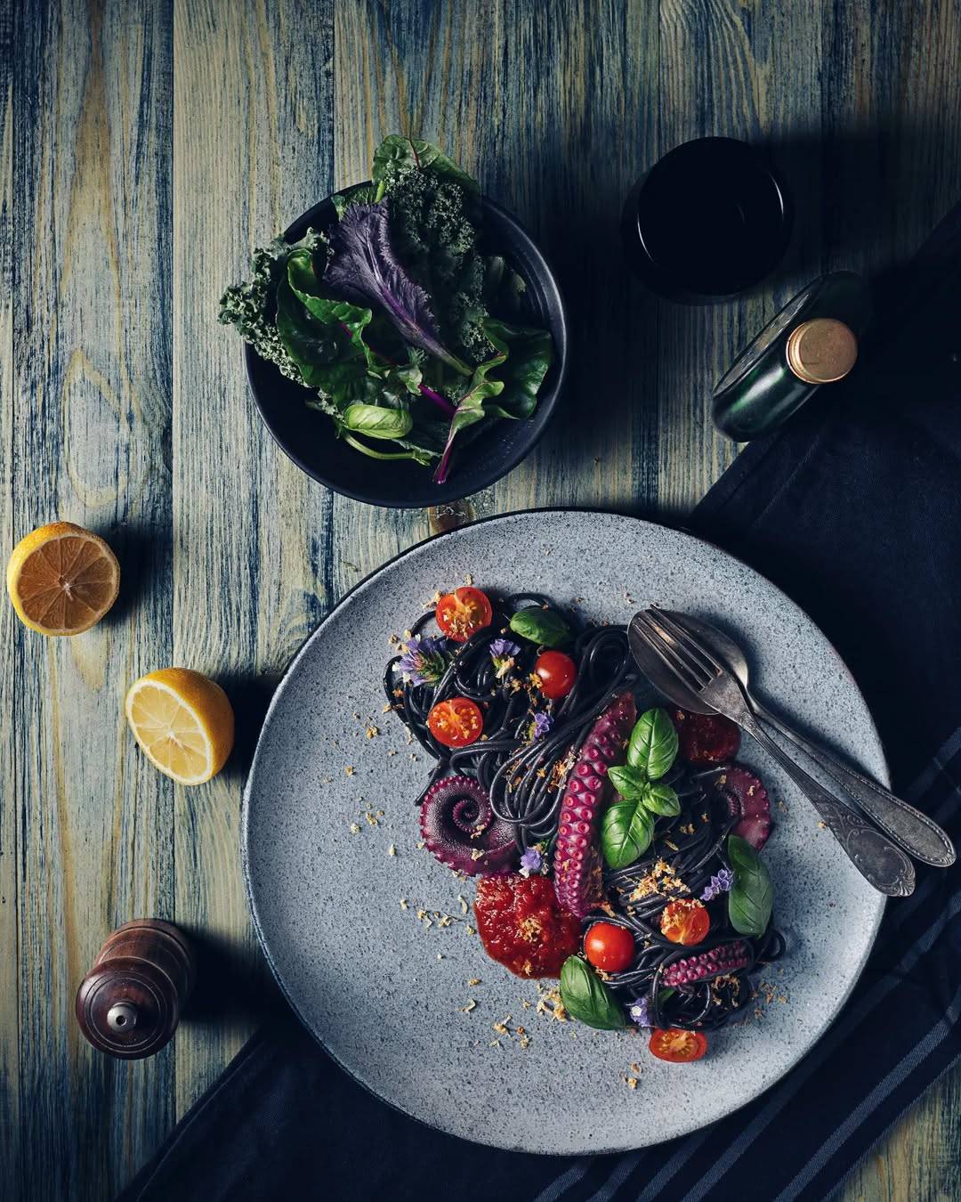 اسباغيتي سوداء بالأخطبوط وطماطم شيرى في طبق من شيف ميدو (الشرق الأوسط)