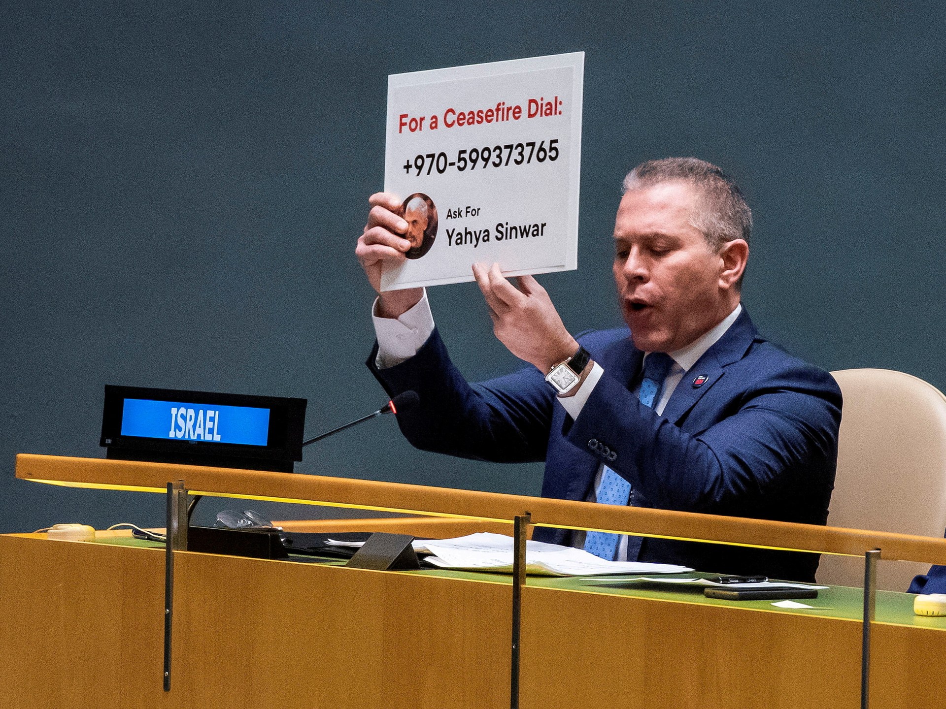 سيل من التهديدات ينهال على سفير إسرائيل بالأمم المتحدة بعد نشره رقم السنوار