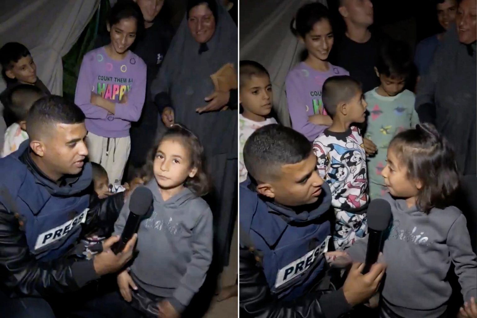 في مشهد عفوي وببراءة الطفولة طلبت الطفلة خديجة من مراسل الجزيرة مباشر حسام شبام أن يتحدث إليها لتوصل رسالتها للعالم، وذلك خلال قيامه بجولة في مخيم اليرموك بمدينة غزة.