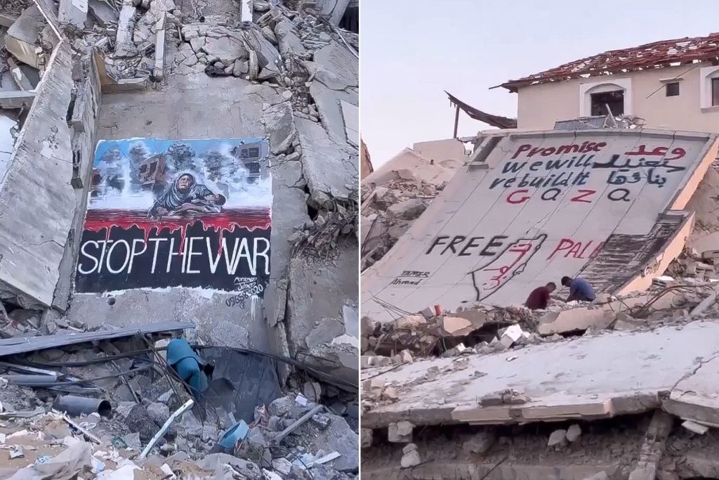 وتنوعت العبارات أو الرسومات المسجلة على الجدران بين رفض للتهجير القسري، ودعوات لوقف الحرب على غزة. ومن أبرز تلك العبارات “أوقفوا الحرب، الحرية لفلسطين، وغدا سنعيد بناءها، حتى الطيور في غزة تمتلك جناحين ولا تهاجر، ما زال ابنى تحت الركام حسبنا الله ونعم الوكيل، لست براحل، باقون كالزعتر والزيتون”.