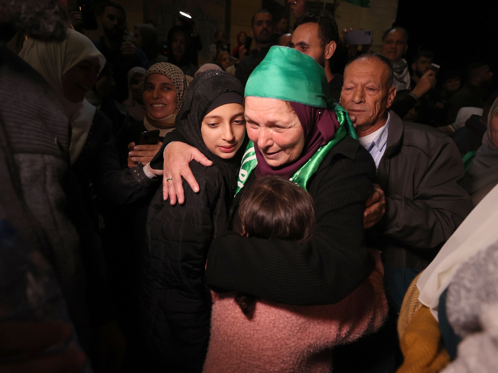 عاش الفلسطينيون ليلة مفعمة بالفرح والدموع في استقبال 39 من الأسرى النساء والأطفال الذين أفرجت سلطات الاحتلال عنهم، مقابل 13 أسيرة وطفلا من الإسرائيليين المحتجزين بقطاع غزة، في أول أيام اتفاق الهدنة الذي توسطت فيه قطر بين إسرائيل وحركة المقاومة الإسلامية (حماس).