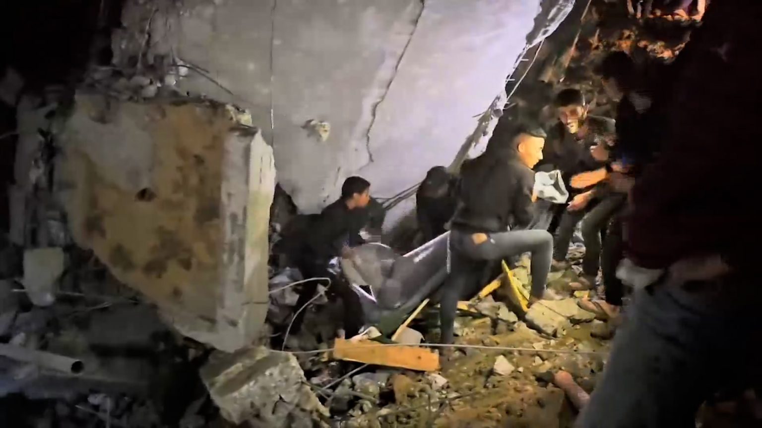 ووثقت كاميرا الجزيرة عمليات انتشال عدد من الشهداء والمصابين والعالقين من تحت الأنقاض بواسطة الطواقم الطبية وفرق الإسعاف، ووصولهم إلى مستشفى شهداء الأقصى بمدينة دير البلح وسط القطاع.