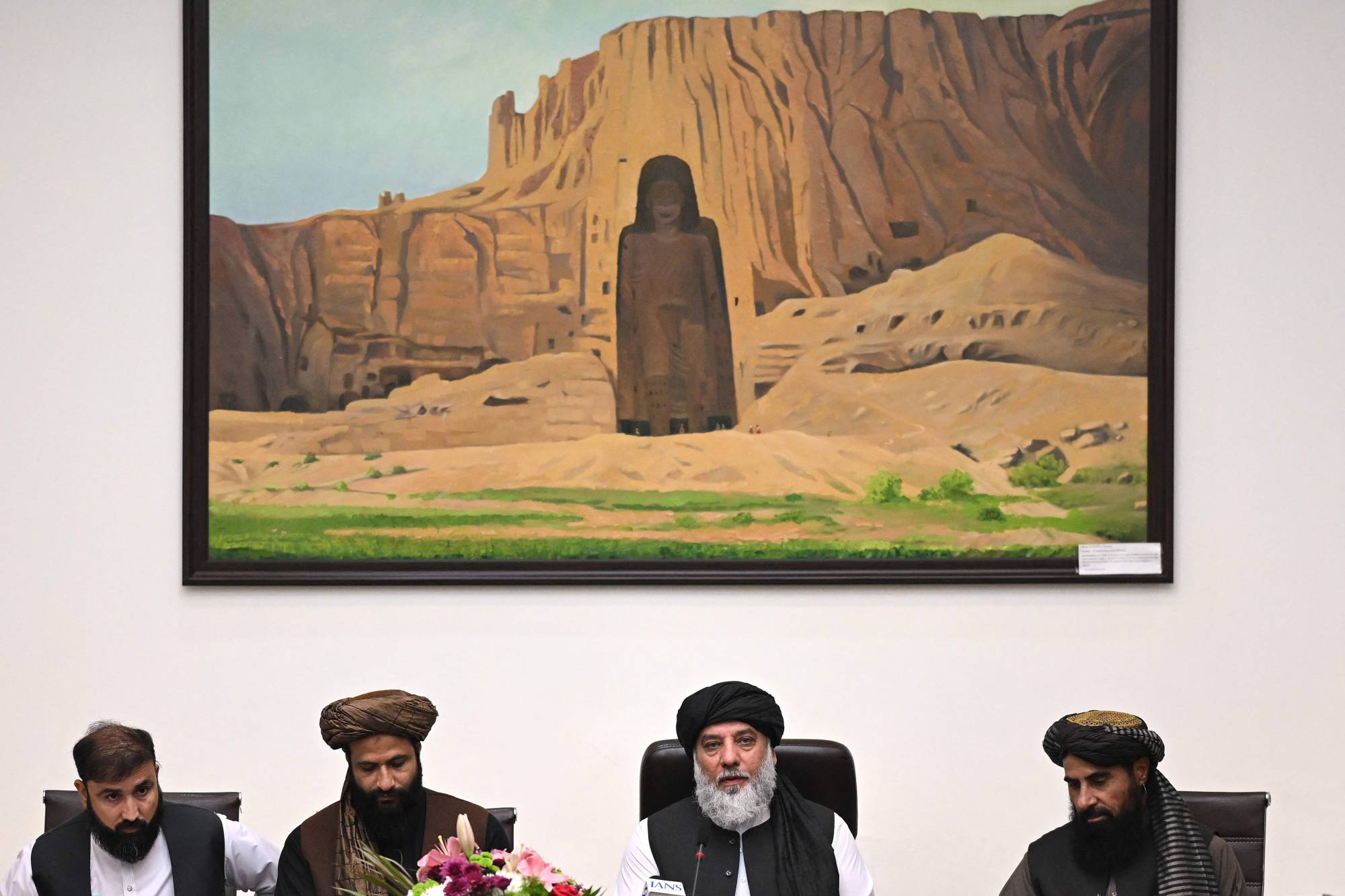 نور الدين عزيزي (الثاني من اليمين) وزير التجارة والصناعة الأفغاني يتحدث خلال مؤتمر صحافي بسفارة كابل في نيودلهي يوم 24 نوفمبر 2025 (أ.ف.ب)