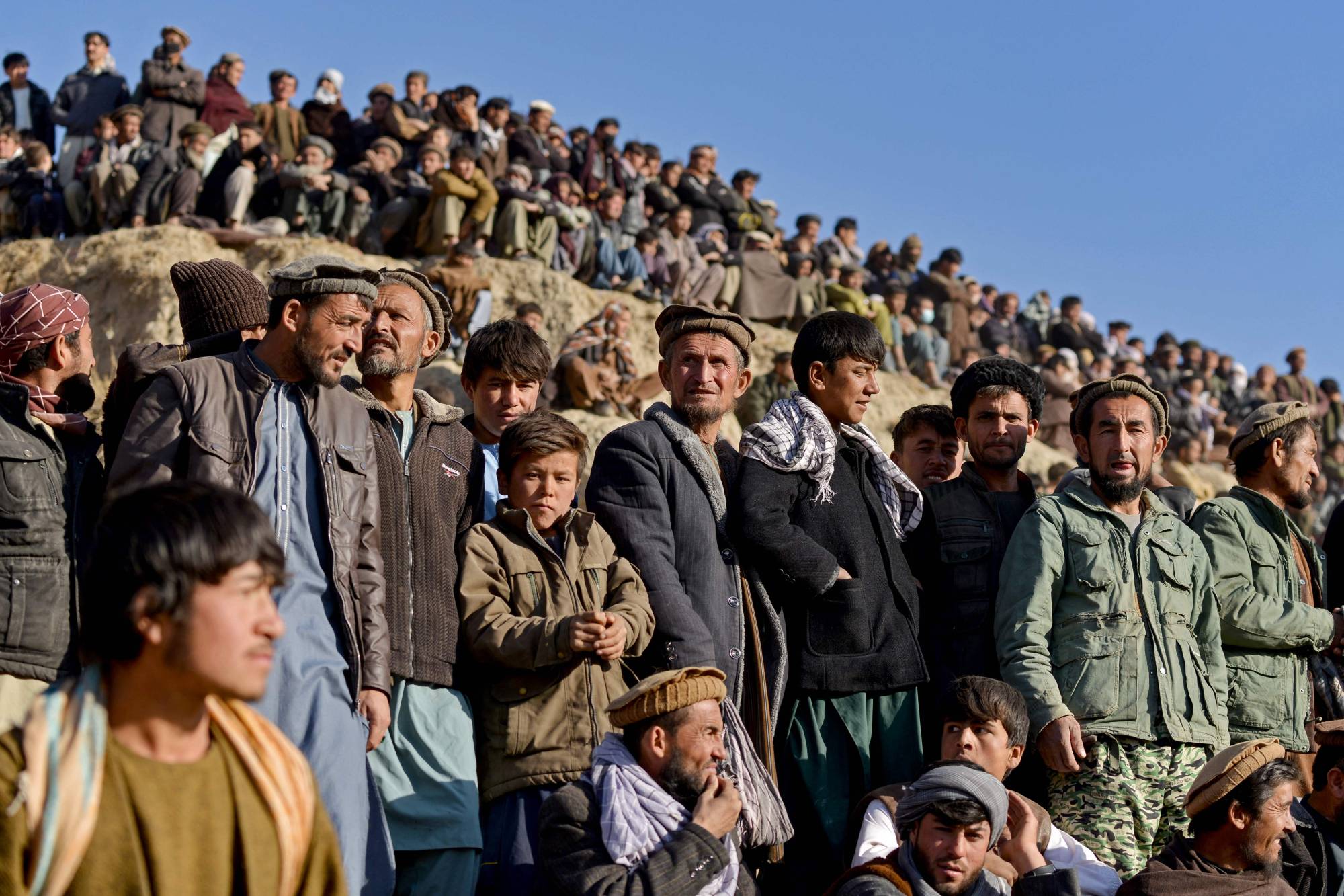 يراقب أفغان من مكان مرتفع فرساناً يتنافسون في رياضة «بوزكاشي – صيد الماعز» التقليدية داخل آسيا الوسطى بحقل بمنطقة أرجو بولاية بدخشان يوم 23 نوفمبر 2025 (أ.ف.ب)