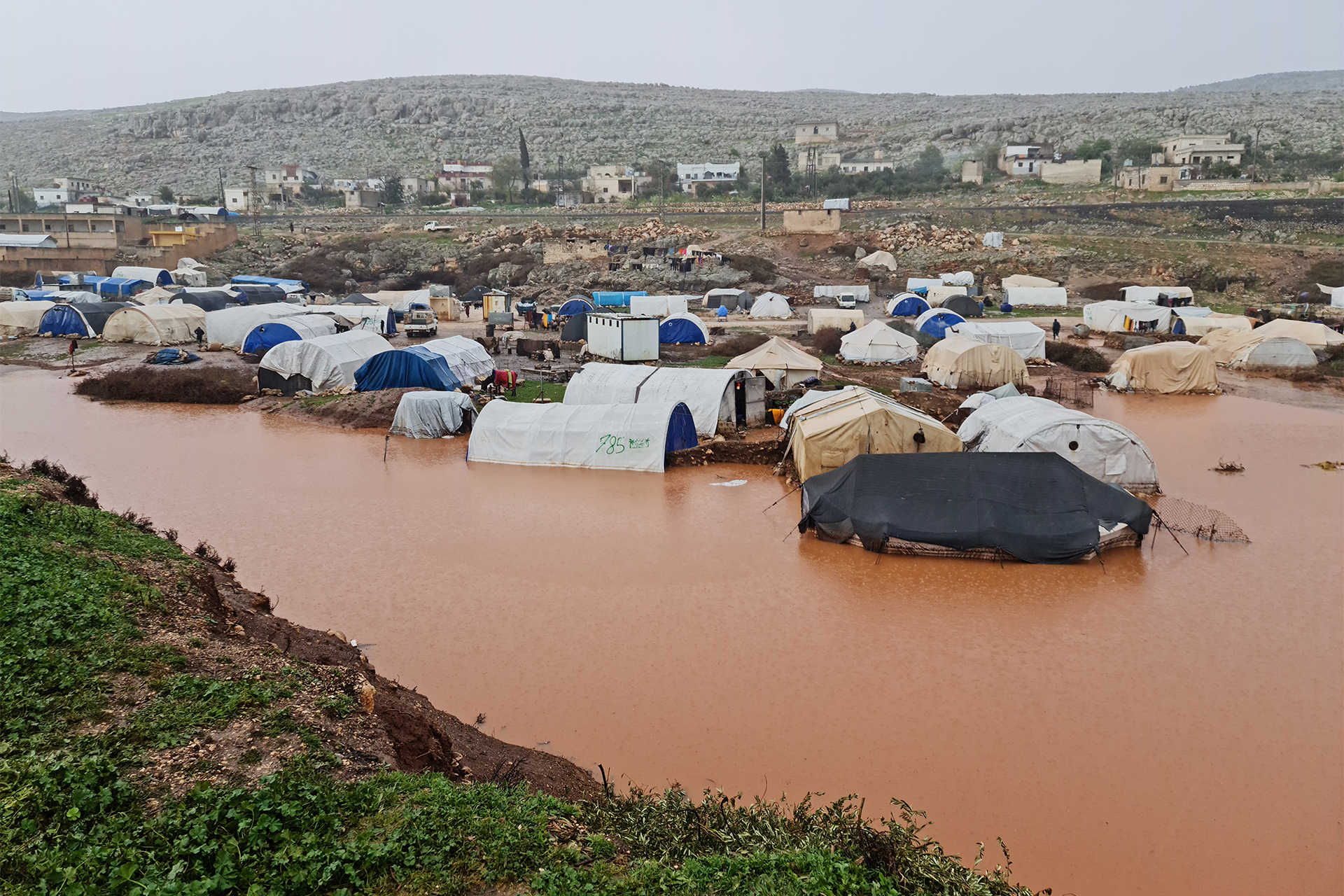 وتشهد مناطق شمال غربي سوريا منخفضاً جوياً بدأ تأثيره أول أمس بهطول أمطار غزيرة، تسببت بسيول جارفة وفيضان لنهر العاصي الذي ارتفع منسوب مياهه، مما أدى لأضرارٍ كبيرة بالمخيمات، وإغلاق بعض الطرقات، وغمرت المياه الأراضي الزراعية كما خلفت أضرارا في أكثر من 525 خيمةً ضمن 43 مخيماً للمهجرين والناجين من الزلزال، حسب ما نشره الدفاع المدني السوري.