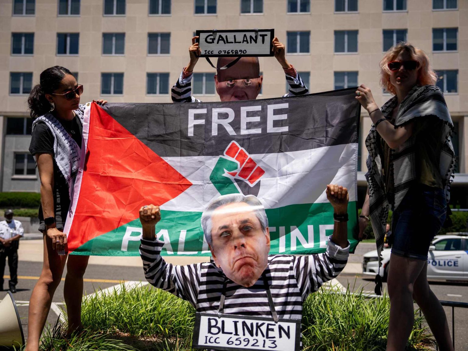 ولدى وصول غالانت للاجتماع بالوزير بلينكن، ردد المتظاهرون هتافات تدعو واشنطن لاعتقال غالانت ومحاكمته على ما سمّوها جرائم الإبادة الجماعية التي يرتكبها جيشه ضد المدنيين الفلسطينيين.