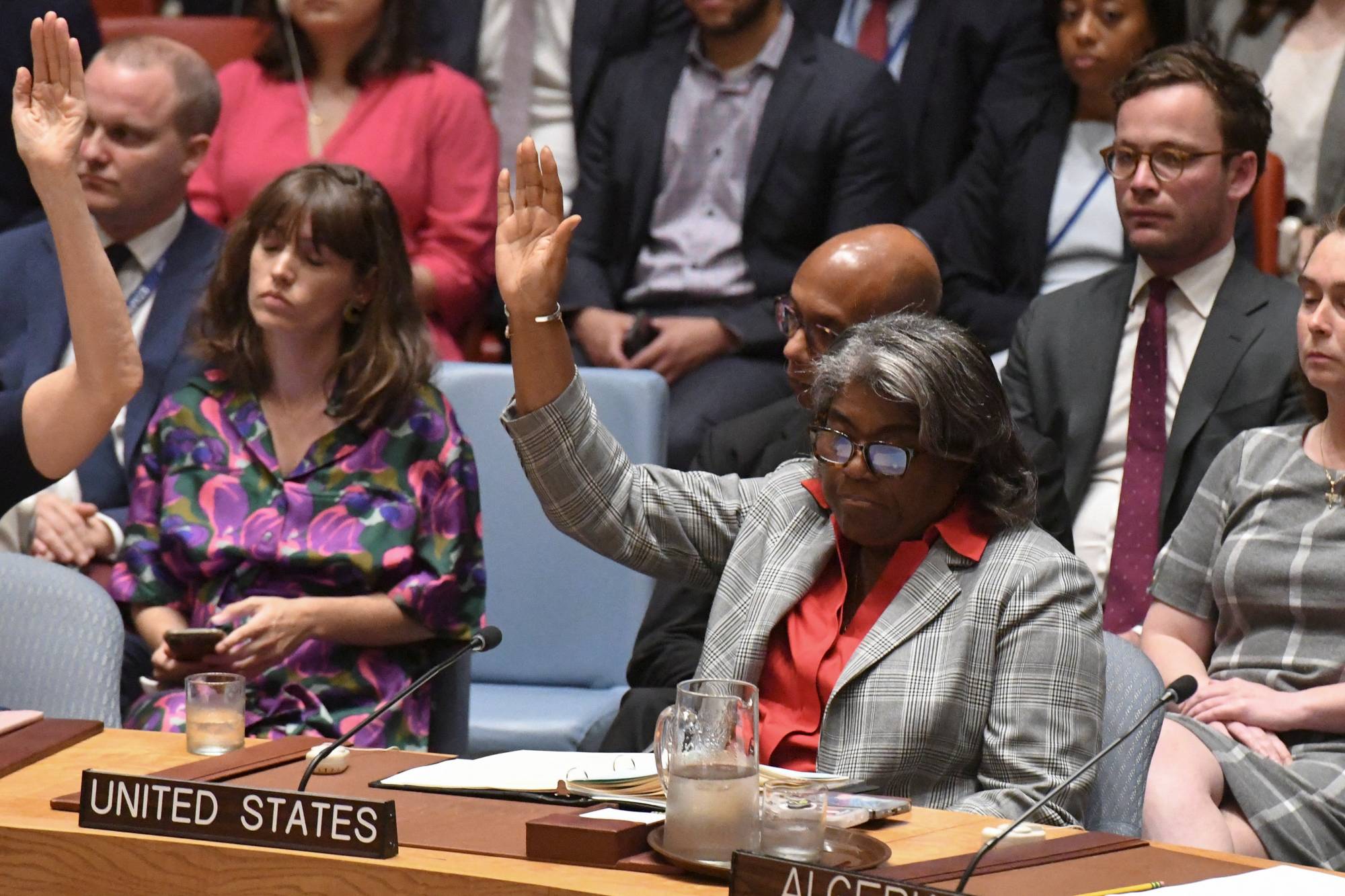 المندوبة الأميركية لدى الأمم المتحدة ليندا توماس غرينفيلد خلال التصويت على المقترح الأميركي بشأن وقف إطلاق النار في غزة 10 يونيو 2024 (رويترز)