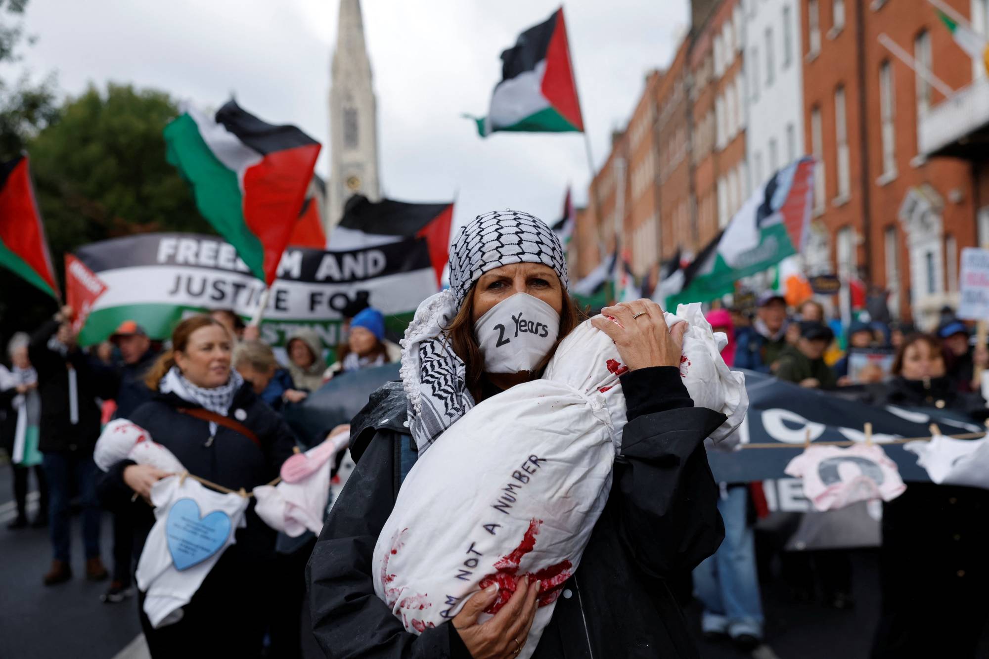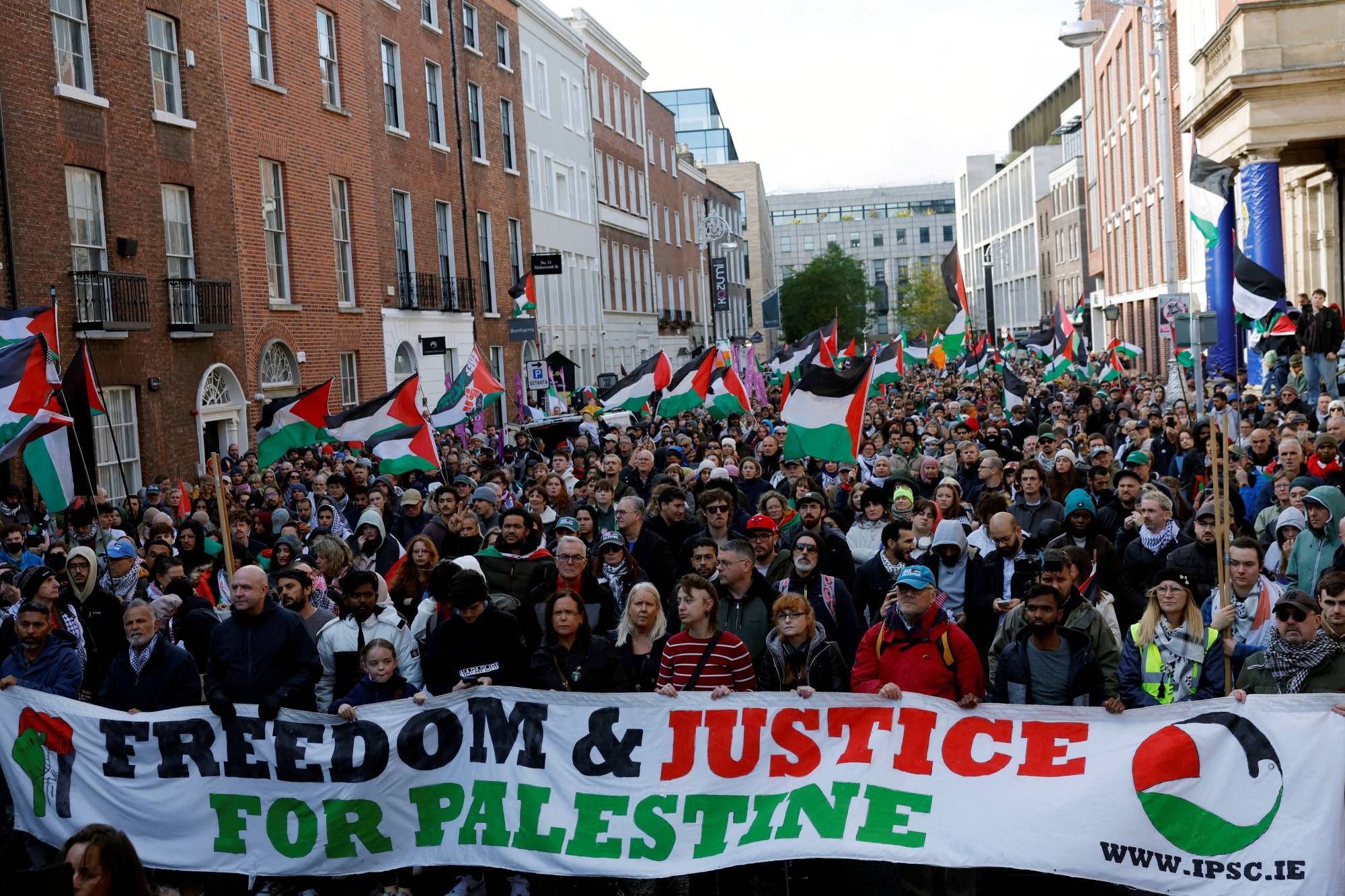 وفي دبلن، تجمّع آلاف الأشخاص أمام البرلمان الآيرلندي لإحياء ذكرى مرور عامين على «الإبادة» في غزة، وفقاً للمنظّمين.