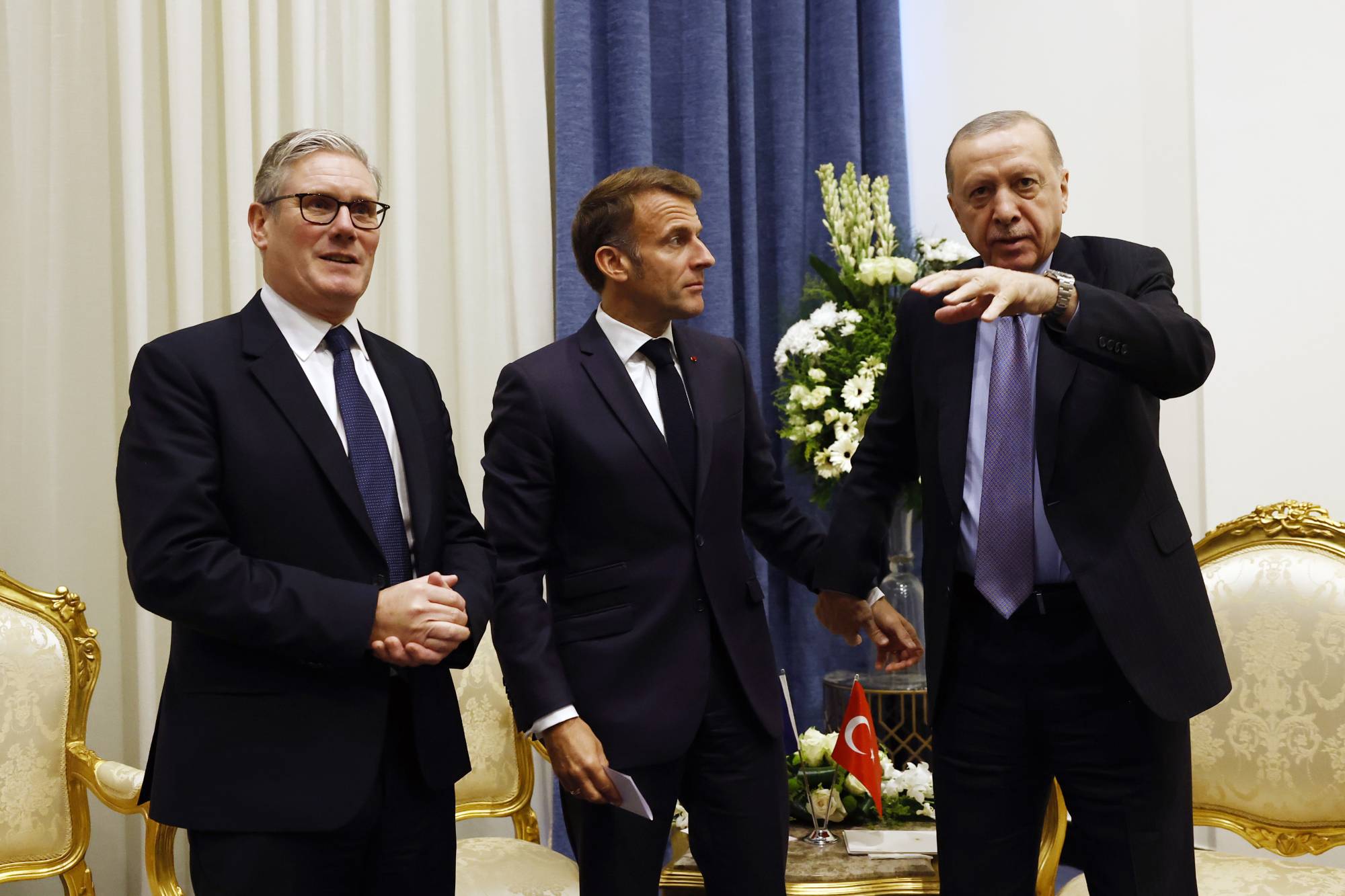 الرئيس الفرنسي إيمانويل ماكرون محاطاً برئيس الحكومة البريطانية كير ستارمر والرئيس التركي رجب طيب إردوغان لدى مشاركتهم في المؤتمر الدولي بشرم الشيخ بشأن غزة الاثنين (أ.ب)