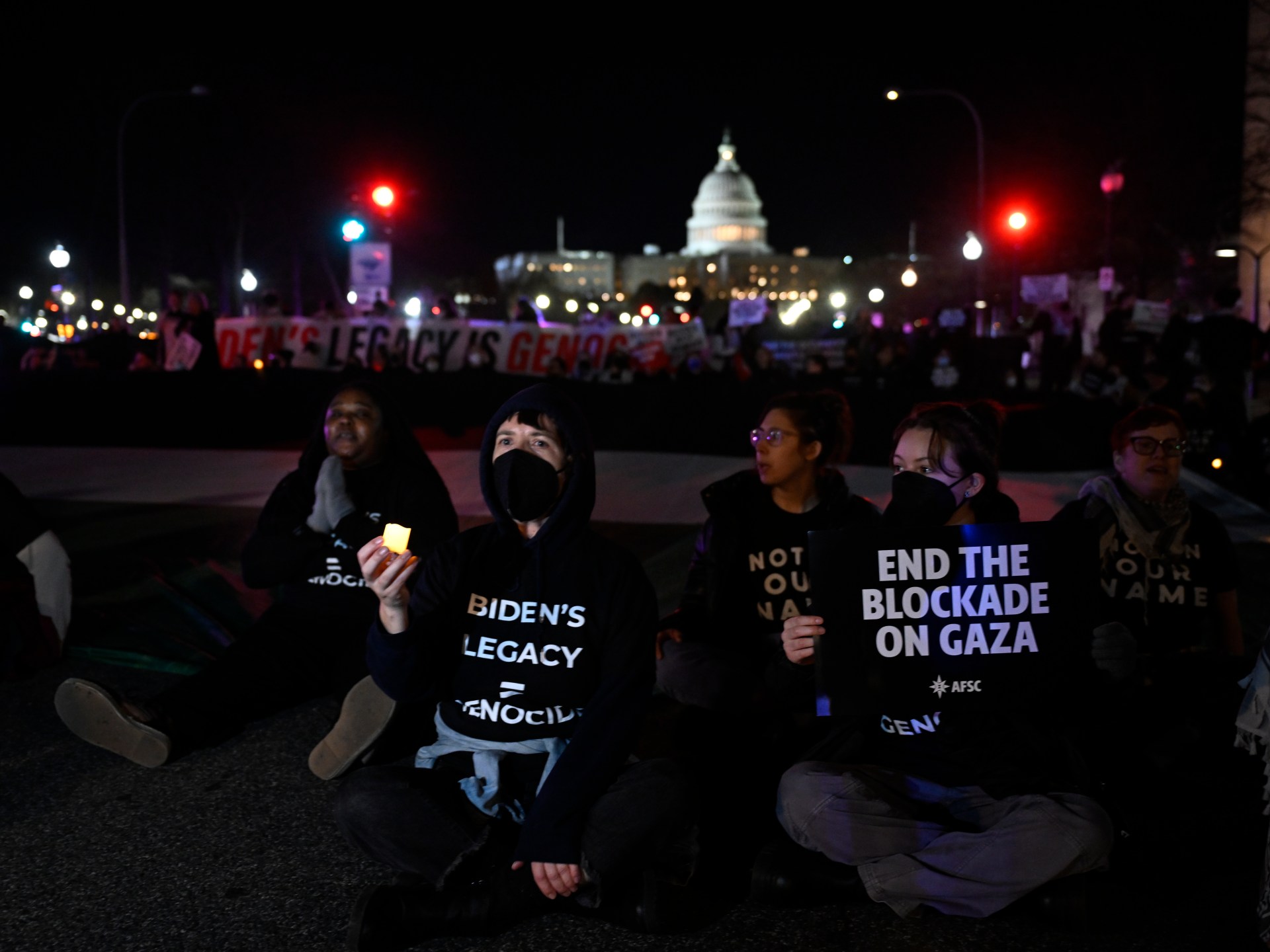 أفاد مراسل الجزيرة بأن محتجين داعمين لفلسطين قطعوا الطريق المؤدي لمبنى الكونغرس للمطالبة بوقف دائم لإطلاق النار في قطاع غزة، في حين أكدت وسائل إعلام أميركية أن موكب الرئيس جو بايدن سلك طريقا أطول من المعتاد للوصول إلى مبنى الكونغرس، بعد أن تفادى الطرق التي تشهد تظاهرات.