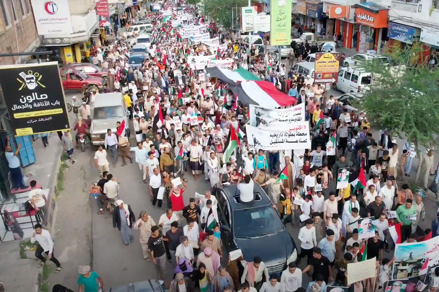 وفي مدينة تعز اليمنية، خرجت جموع غفيرة تضامنا مع القضية الفلسطينية، شاركت فيها الأحزاب والمكونات السياسية والهيئة الشعبية لنصرة قضايا فلسطين.