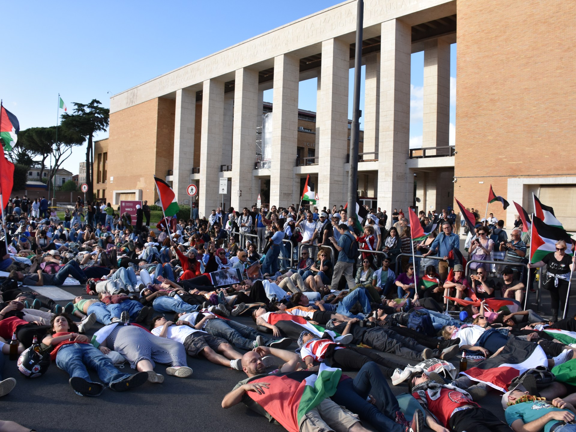 وتجمع حوالي ألفي شخص عند مدخل جامعة سابينزا في روما احتجاجا على هجمات إسرائيل في رفح وغيرها من مناطق قطاع غزة.
