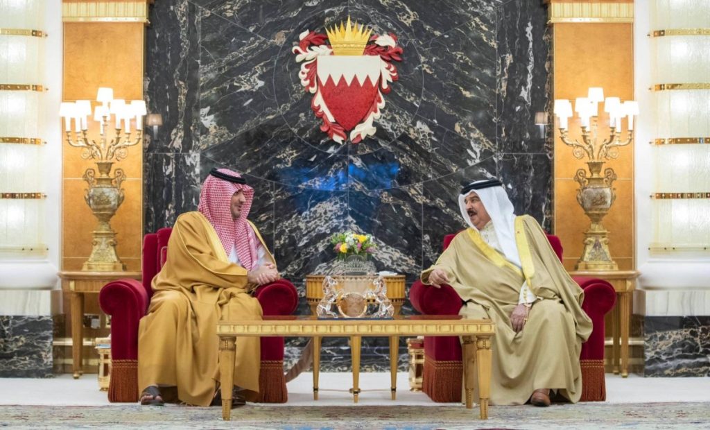 الملك حمد بن عيسى خلال استقباله الأمير عبد العزيز بن سعود في قصر الصخير الأربعاء (واس)