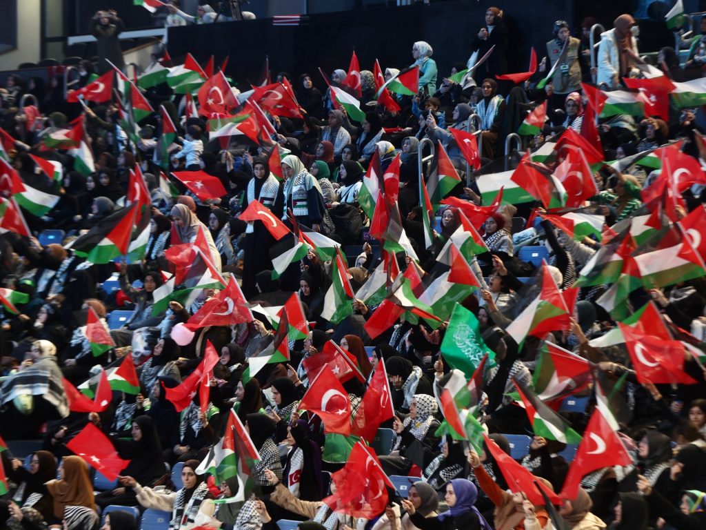 ولوح آلاف الأشخاص الذين ملؤوا القاعة بالأعلام التركية والفلسطينية، ورافقوا الأناشيد الدينية ورددوا شعارات مناهضة لإسرائيل.