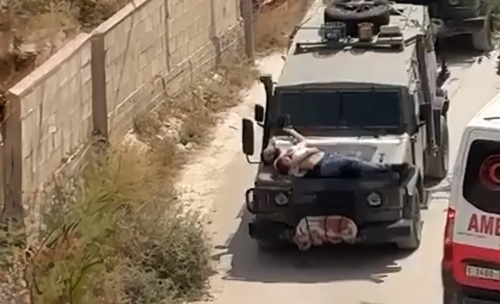وأظهرت مقاطع فيديو الشاب الفلسطيني مجاهد رائد عبادي ممددا ومقيدا على غطاء المركبة العسكرية التي كانت تمر في أحد شوارع جنين بين سيارتي إسعاف.