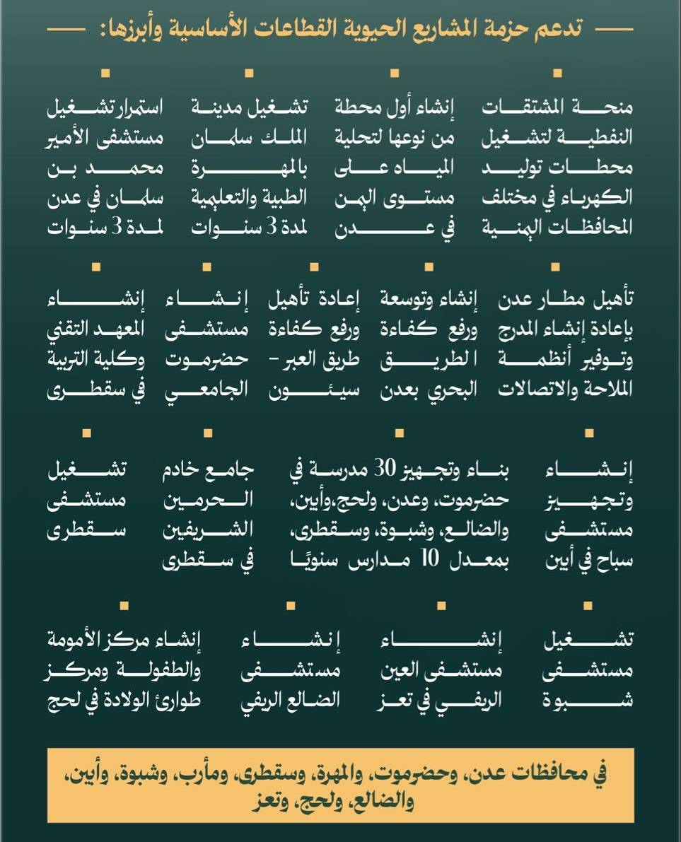 كما تشمل مشروع المقر الحكومي والمجمع الرئاسي دعماً لمسيرة التنمية في اليمن، وتمكين المؤسسات الحكومية اليمنية من أداء دورها، وإنشاء وتوسعة ورفع كفاءة الطريق البحري، بما ينعكس على الارتقاء بالتنقل داخل المحافظة.