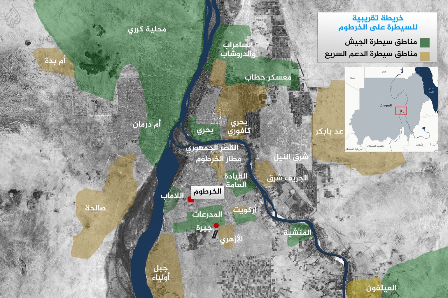 ورغم انفتاح الجيش على مواقع جديدة، فإن قوات الدعم السريع لا تزال تسيطر أيضا على أحياء الرياض والمنشية والمعمورة والصحافة وأَركويت وبري والطائف والجريف شرقي الخرطوم، فضلا عن أحياء ما تعرف بمنطقة جنوب الحزام، وضاحية سوبا حتى حدود ولاية الجزيرة وسط البلاد.