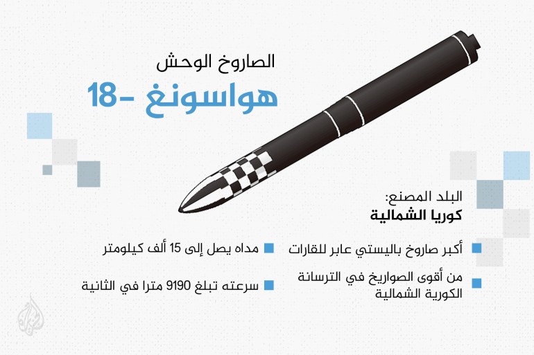 وفي الآونة الأخيرة، أعلنت كوريا الشمالية عن نجاح اختبار صاروخ “هواسونغ-18-19” العابر للقارات والذي يعمل بالوقود الصلب، مؤكدة أنه حلق أعلى وأبعد من أي صاروخ سابق، وهذا يعزز قدراتها الإستراتيجية ويعتبر من بين الأقوى في ترسانتها.