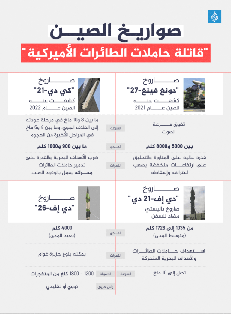 ونجد على رأس منظومة الصواريخ الصينية التي تهدد الأصول البحرية الأميركية، مجموعة “دونغ فينغ” (Dongfeng) التي تعرف بالعربية باسم “رياح الشرق”، ومن بينها صاروخ (دونغ فينغ-27) المعروف باسم “قاتل حاملات الطائرات”، وكانت وزارة الدفاع الصينية قد كشفت عنه لأول مرة عام 2021، واعتبرته وسائل الإعلام سلاحًا قادرًا على تقليص الهيمنة الأميركية العالمية.