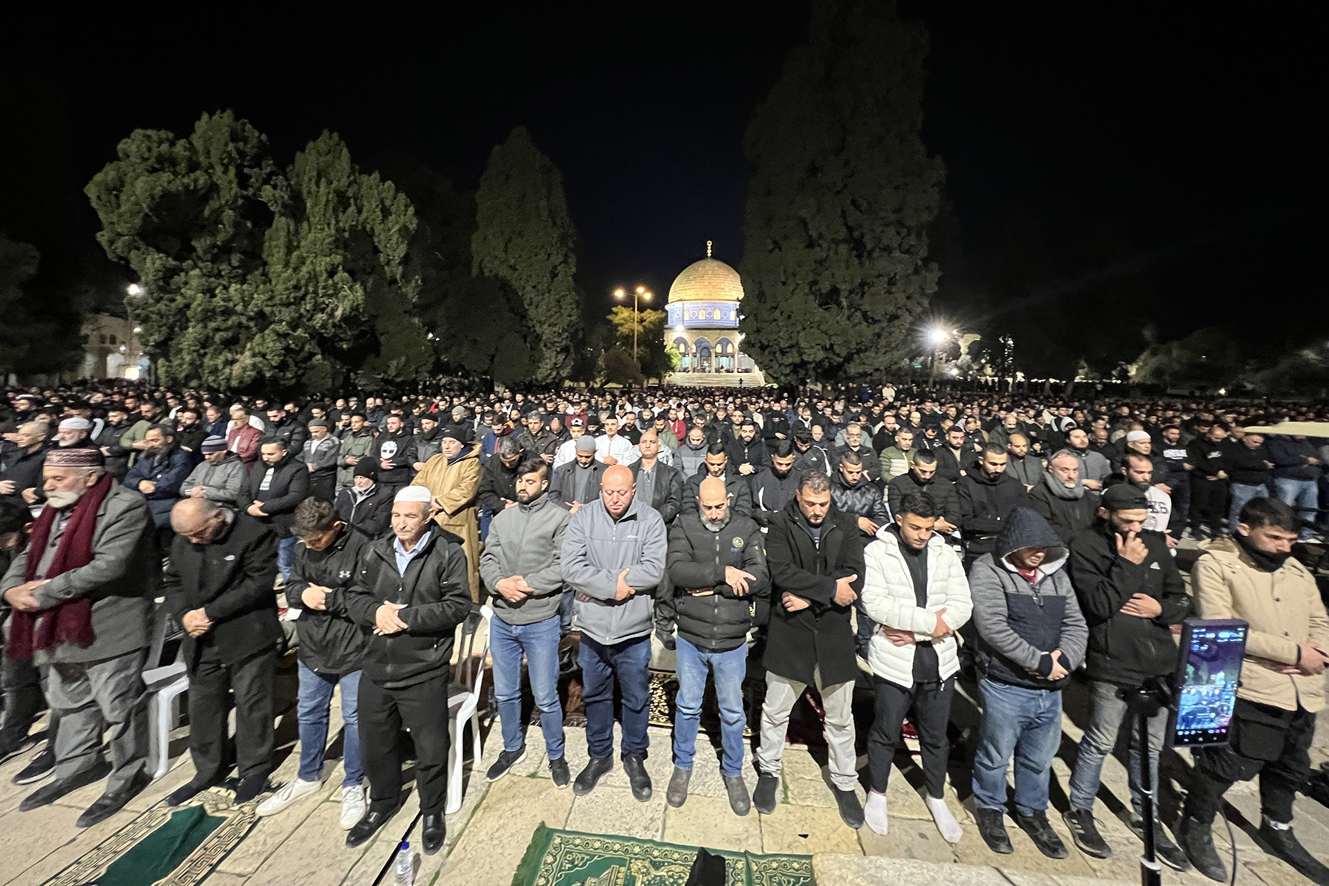 وبينما صلى بضعة آلاف صلاتي العشاء والتراويح بالمسجد الشريف في الليلة الأولى، أدى عشرات الشبان الصلاة أمام الأبواب، ولم يسلم هؤلاء من الاعتداء عليهم ومحاولة تفريقهم وإبعادهم، بينما تمكن نحو 35 ألفا من أداء صلاة التراويح ثانية ليالي الشهر الفضيل.