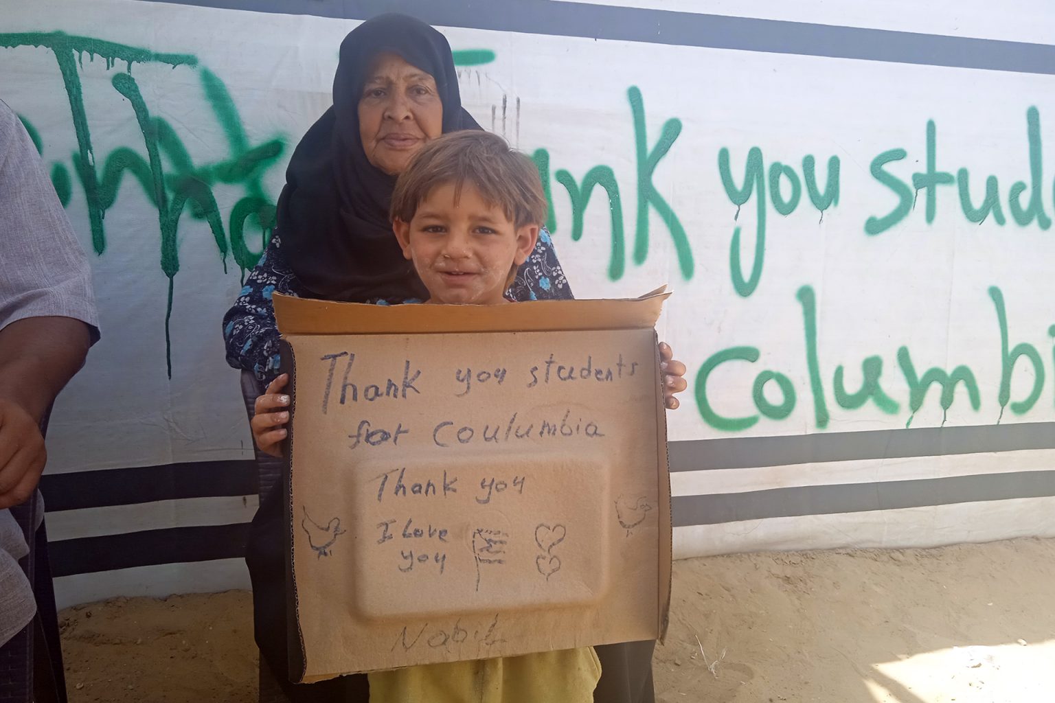 وبعثت صفية رسالة مكثفة إلى الطلبة المنتفضين حول العالم “استمروا واضغطوا لحماية دماء أطفالنا”، ومنهم طفلها نبيل (3 أعوام) الذي يدور بين الخيام حاملا قطعة كرتونية كُتب عليها باللغة الإنجليزية “شكرا طلبة جامعة كولومبيا، أنا أحبكم”.