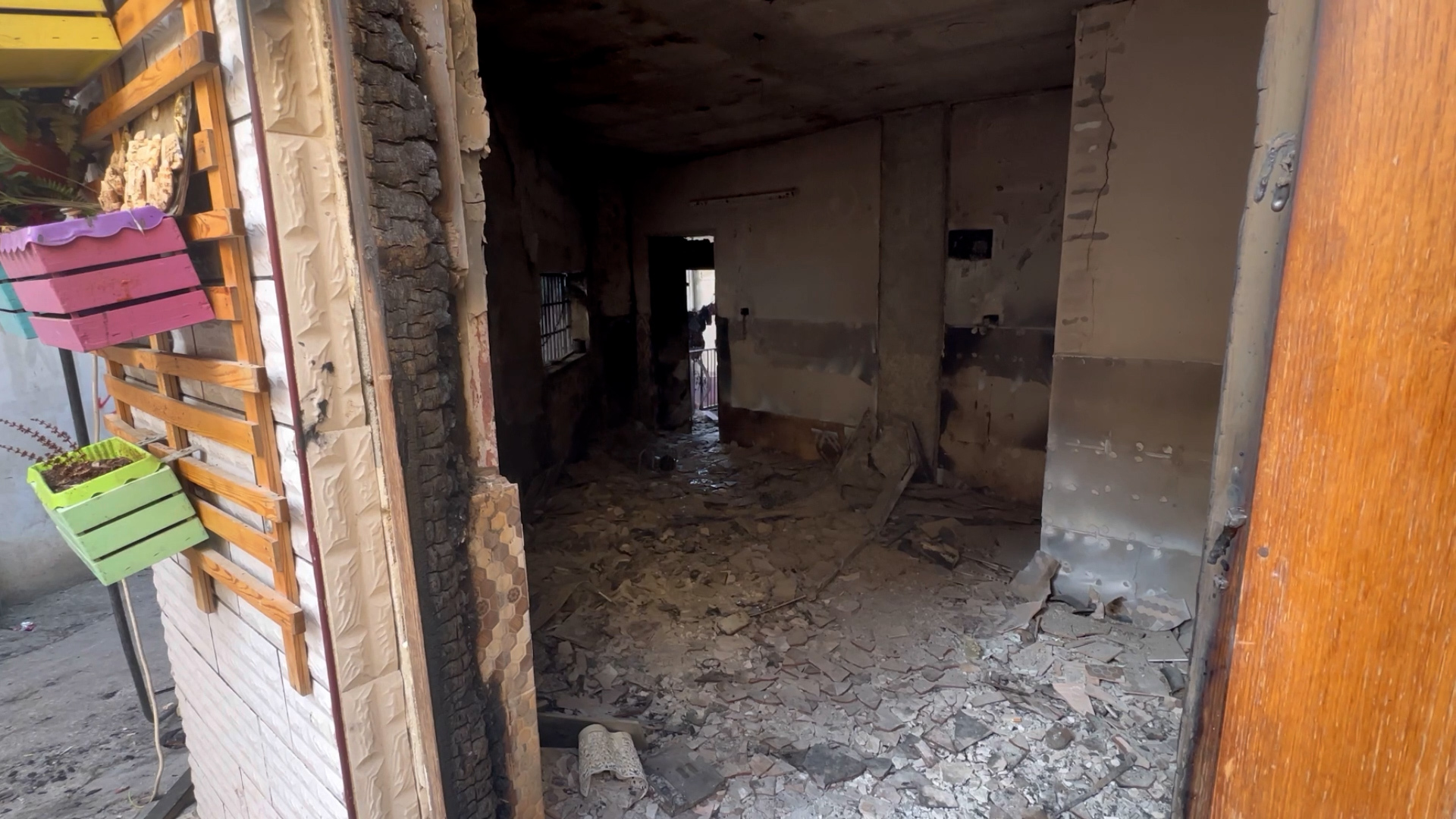 يقول أبو العز “دخلوا على زوجتي وبناتي بالسكين، هددوهن بها، وحين رآهم طفلي الصغير وقع مغشيا عليه من شدة الخوف، هذا منزل ابني لم يفرح به، المفروض أنه عش الزوجية له، تحوّل إلى كومة من الركام، حتى المطبخ كسروه، وحطموا خزائنه، شاشة التلفاز كسروها كلها، حتى الستائر قطعوها بالسكين”.