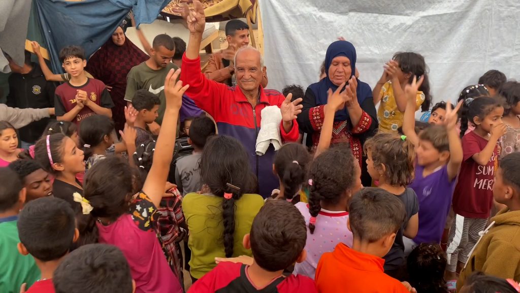 غزة- على جدار خيمة، يبدأ محمد الخضري عرض فيلم كرتوني، وقد تجمع من حوله عشرات النازحين جلهم من الأطفال، وبينهم بالغون أنهكتهم الحرب الدائرة منذ 7 شهور في غزة، ويبحثون عن لحظات فرح من وسط الدم النازف وأكوام الركام والدمار.