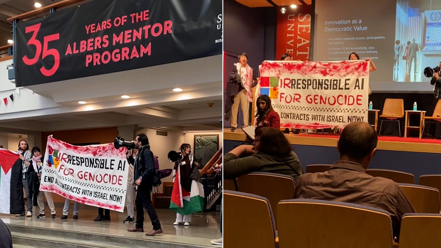 وفي ختام المؤتمر، قاطع أحد المحتجين رئيس جامعة سياتل، موجهًا له انتقادًا حادًا لاستضافة فعالية قال، إنها تهدف إلى “تلميع صورة شركة متورطة في تدمير الجامعات في غزة باستخدام تقنياتها الخاصة” بحسب البيان.