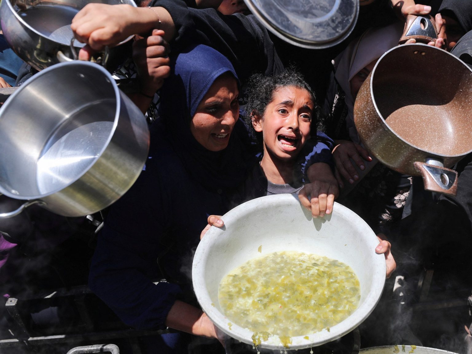 Palestinians queue for a portion of hot food distributed by a charity kitchen at the Nuseirat refugee camp in the central Gaza Strip on May 5, 2025.