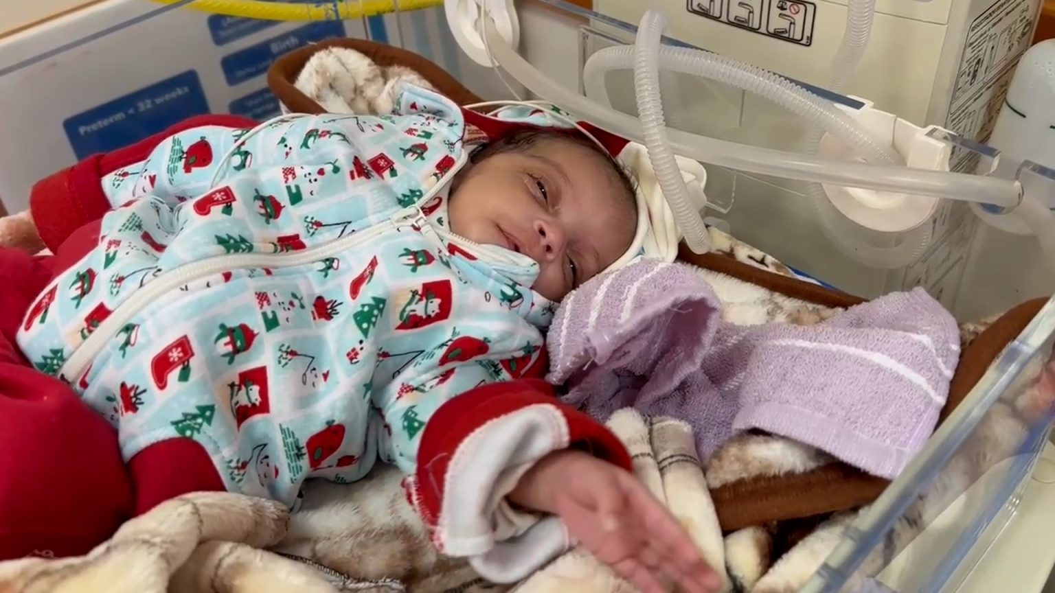 الطفلة البالغة من العمر 77 يوما، أبصرت النور قبل أوانها في مستشفى العودة بمخيم النصيرات وسط قطاع غزة، جراء استشهاد والدتها هنادي أبو عمشة، بعد إصابتها بجراح بالغة في قصف إسرائيلي.