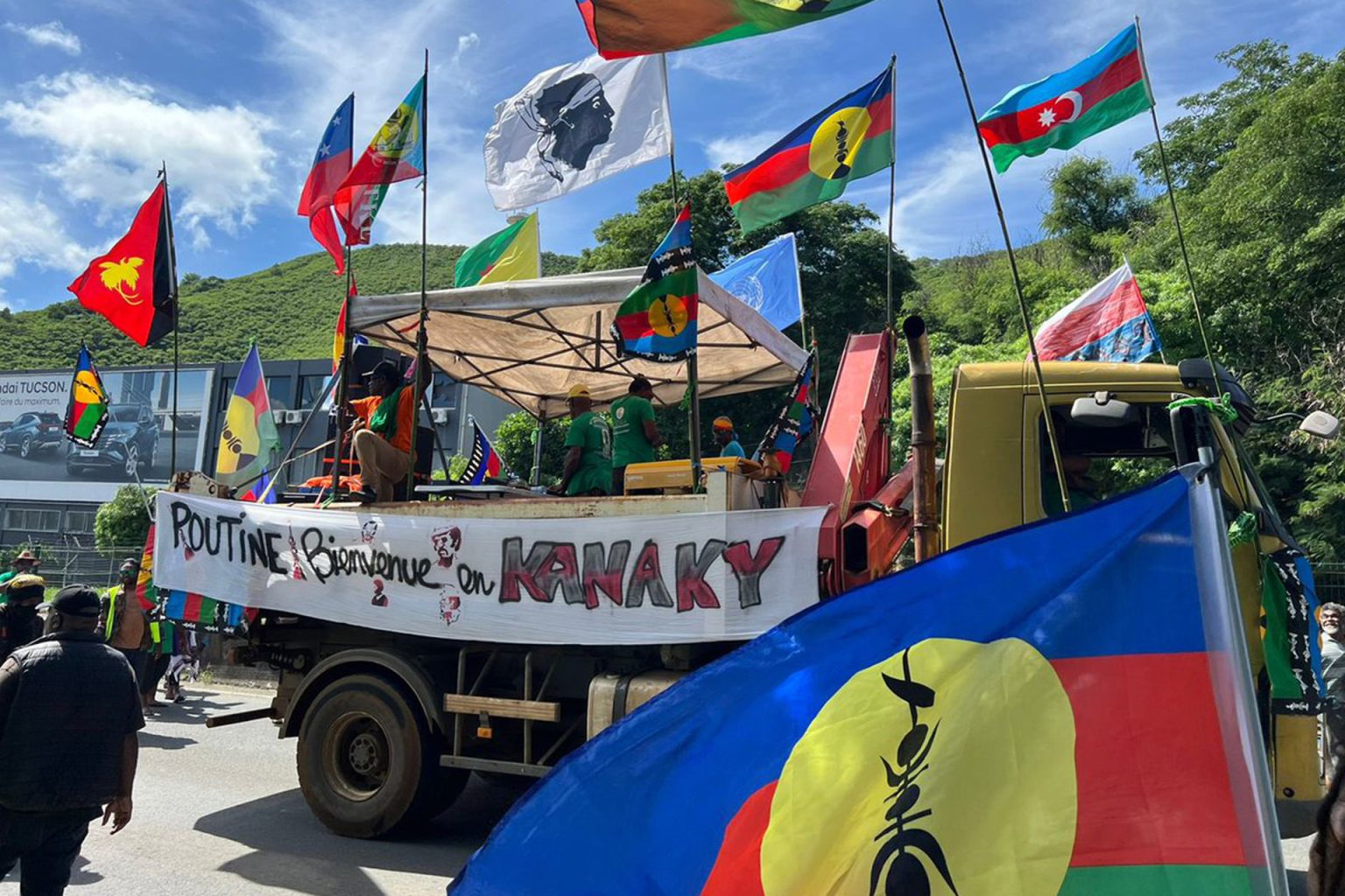 وقد كشف تحقيق لإذاعة فرنسا عن صور لمظاهرة مؤيدة للاستقلال في نوميا يوم 28 مارس/آذار الماضي، ظهرت فيها أعلام أذربيجان ولافتة مكتوب عليها “بوتين، مرحبا بك في كاناكي” و”أذربيجان تعتمد على الانفصاليين في جميع أقاليم ما وراء البحار”.