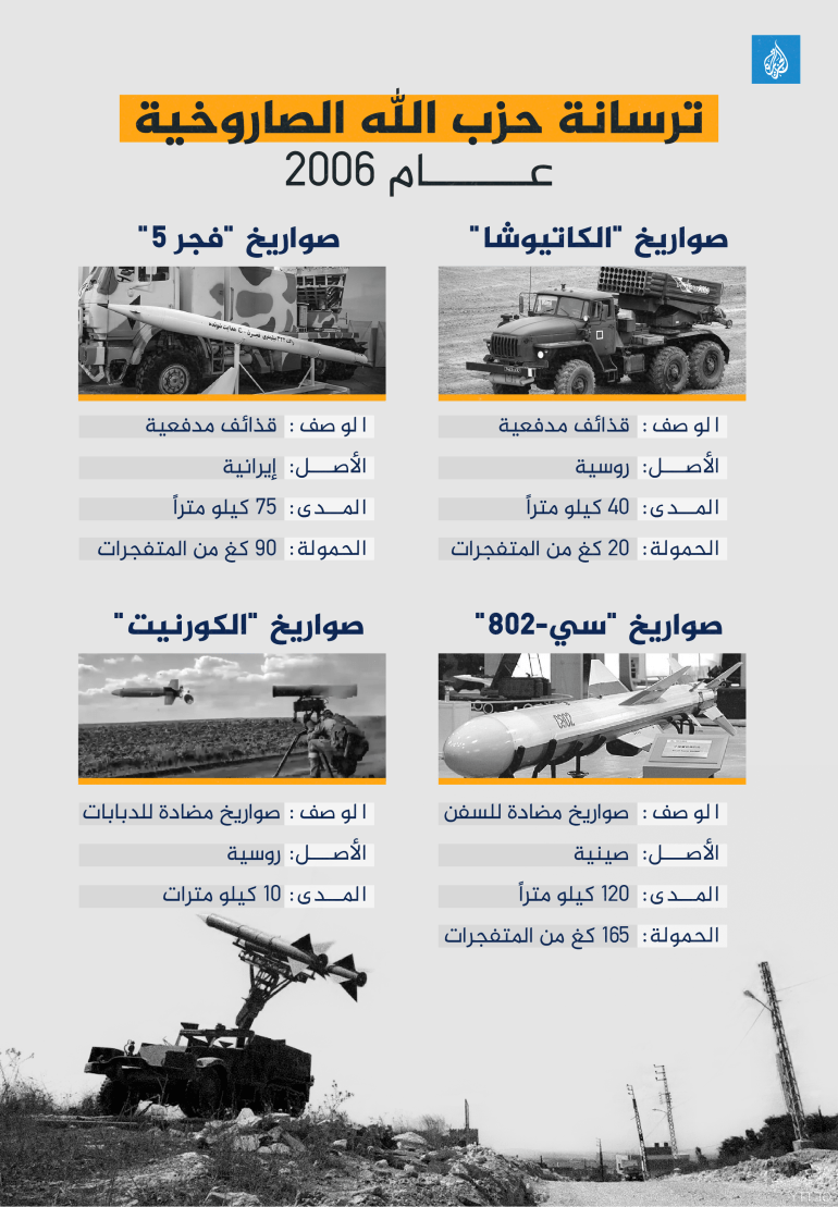 هذا فضلا عن مجموعة متنوعة من الصواريخ المضادة للسفن أهمها صواريخ “سي-802” (C-802) الصينية المنشأ، التي يصل مداها إلى 120 كيلومترا، وهي مزودة برأس حربي يزن 165 كيلوغراما، وقد مكنت حزب الله من استهداف الفرقاطة الإسرائيلية “آي إن إس خانيت” أو “الرمح”، وهي إحدى ثلاث فرقاطات من طراز “ساعر 5” بنتها شركة نورثروب غرومان للجيش الإسرائيلي، وتكلف الواحدة منها أكثر من 250 مليون دولار؛ لذا فإن تدميرها فرض هيمنة نفسية مبكرة لحزب الله على مجريات الحرب.